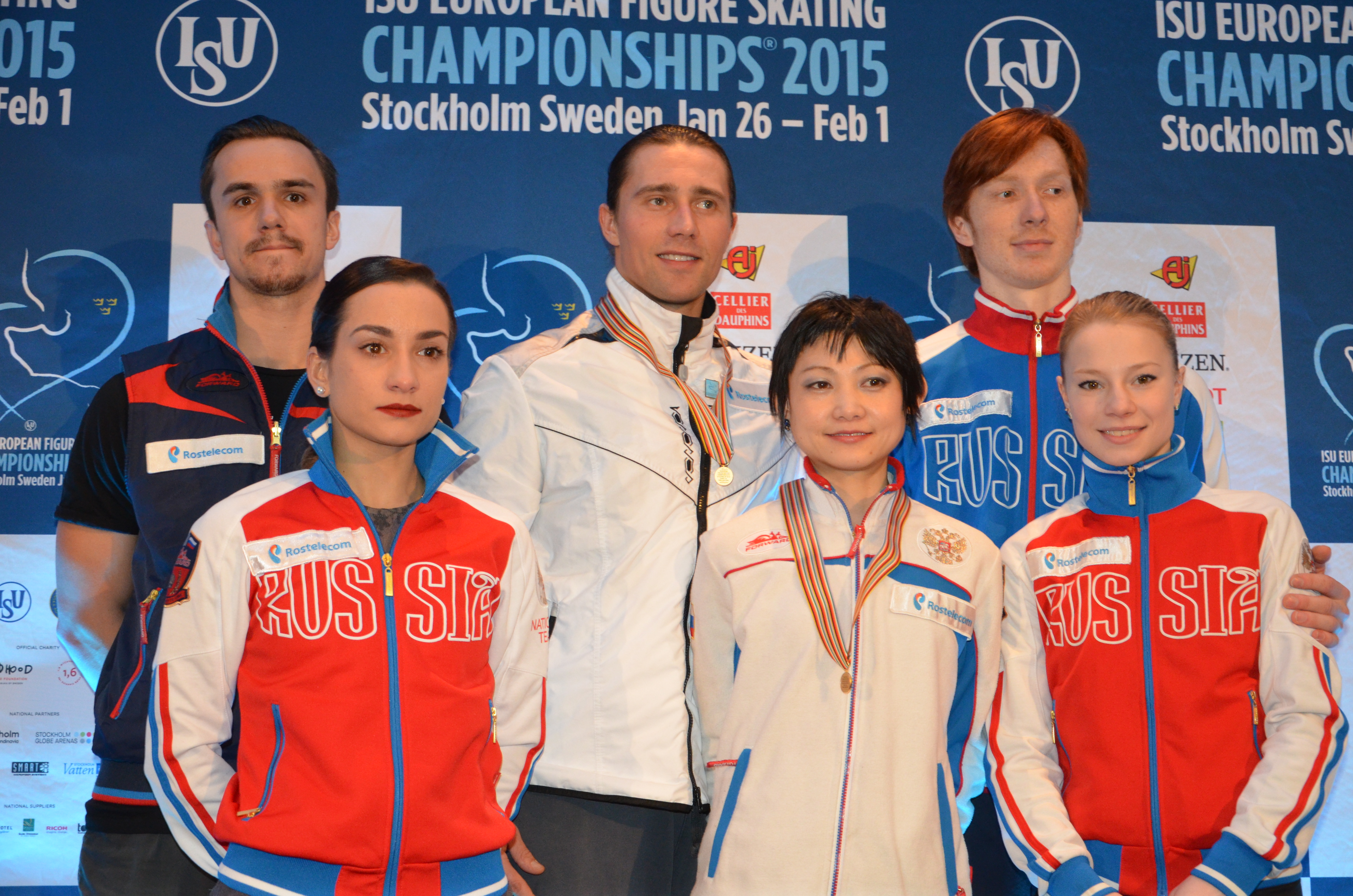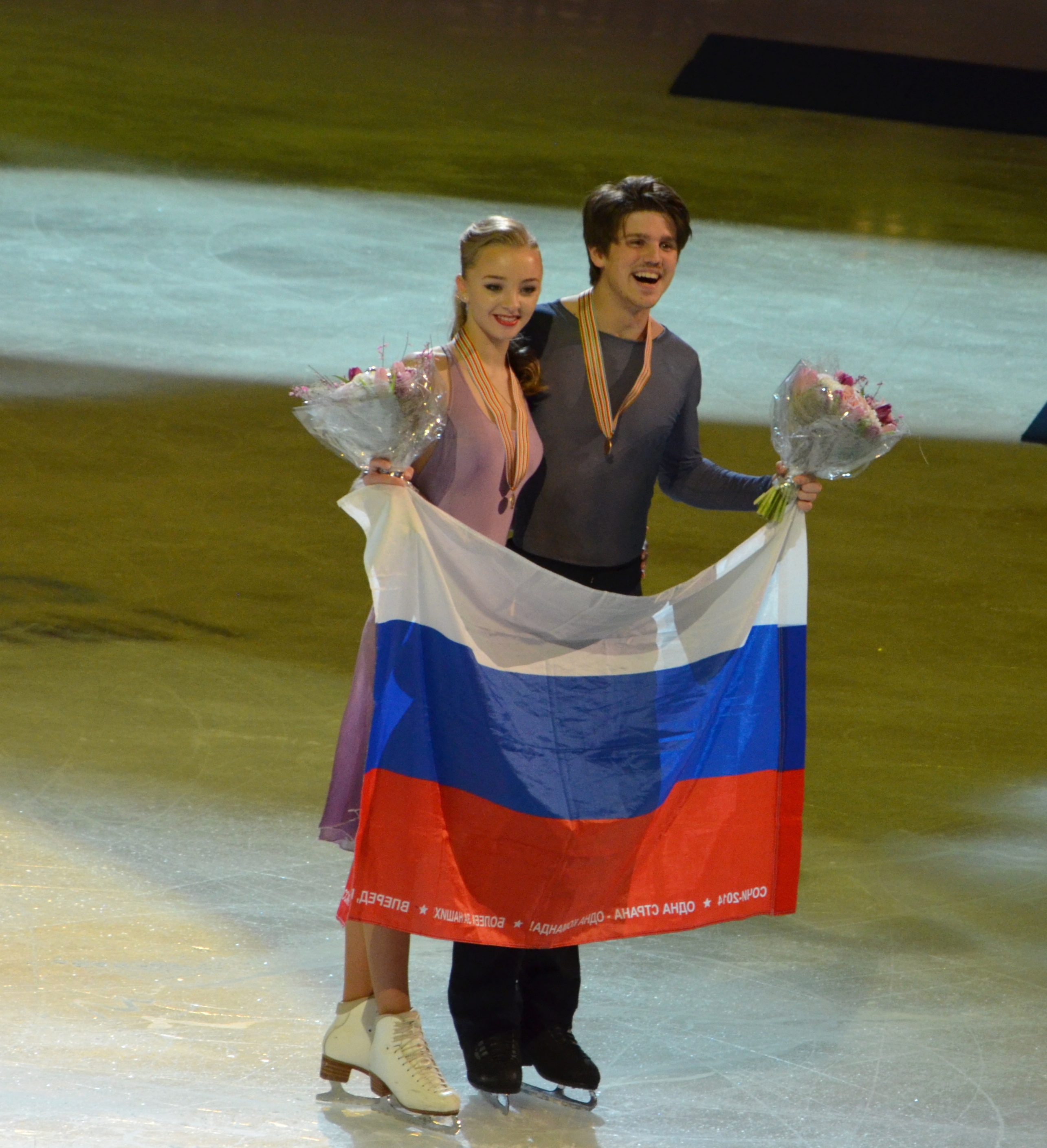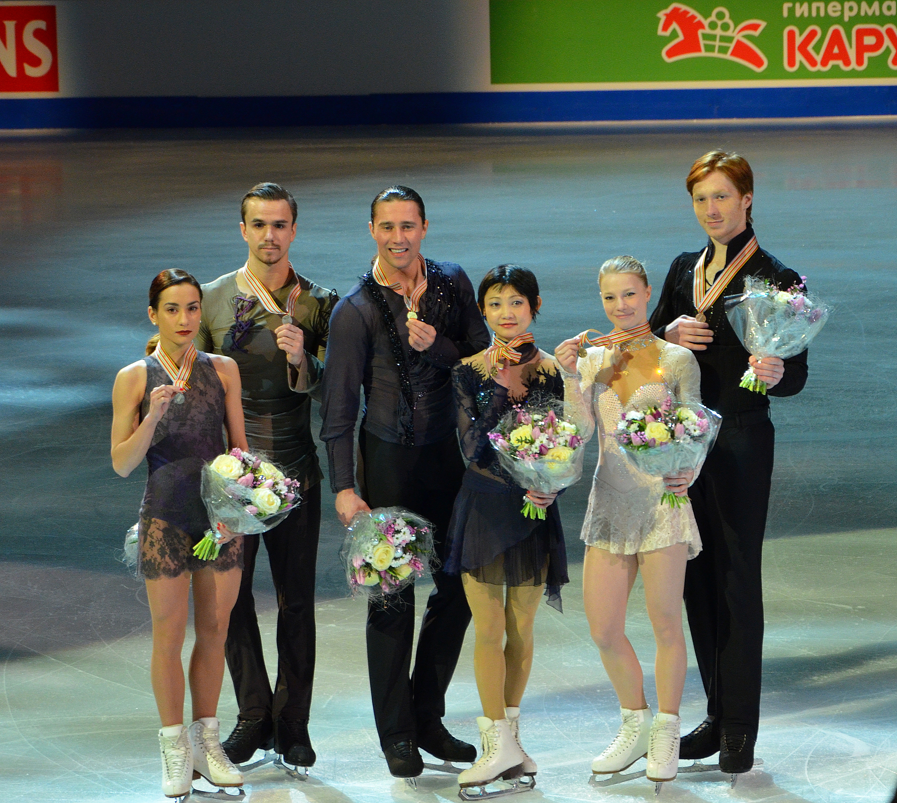 Yuko Kavaguti/Alexander Smirnov of Russia struck gold and led a Russian sweep in the Pairs event. Ksenia Stolbova/Fedor Klimov settled for the silver medal and Evgenia Tarasova/Vladimir Morozov moved up from fifth to earn the bronze medal.
