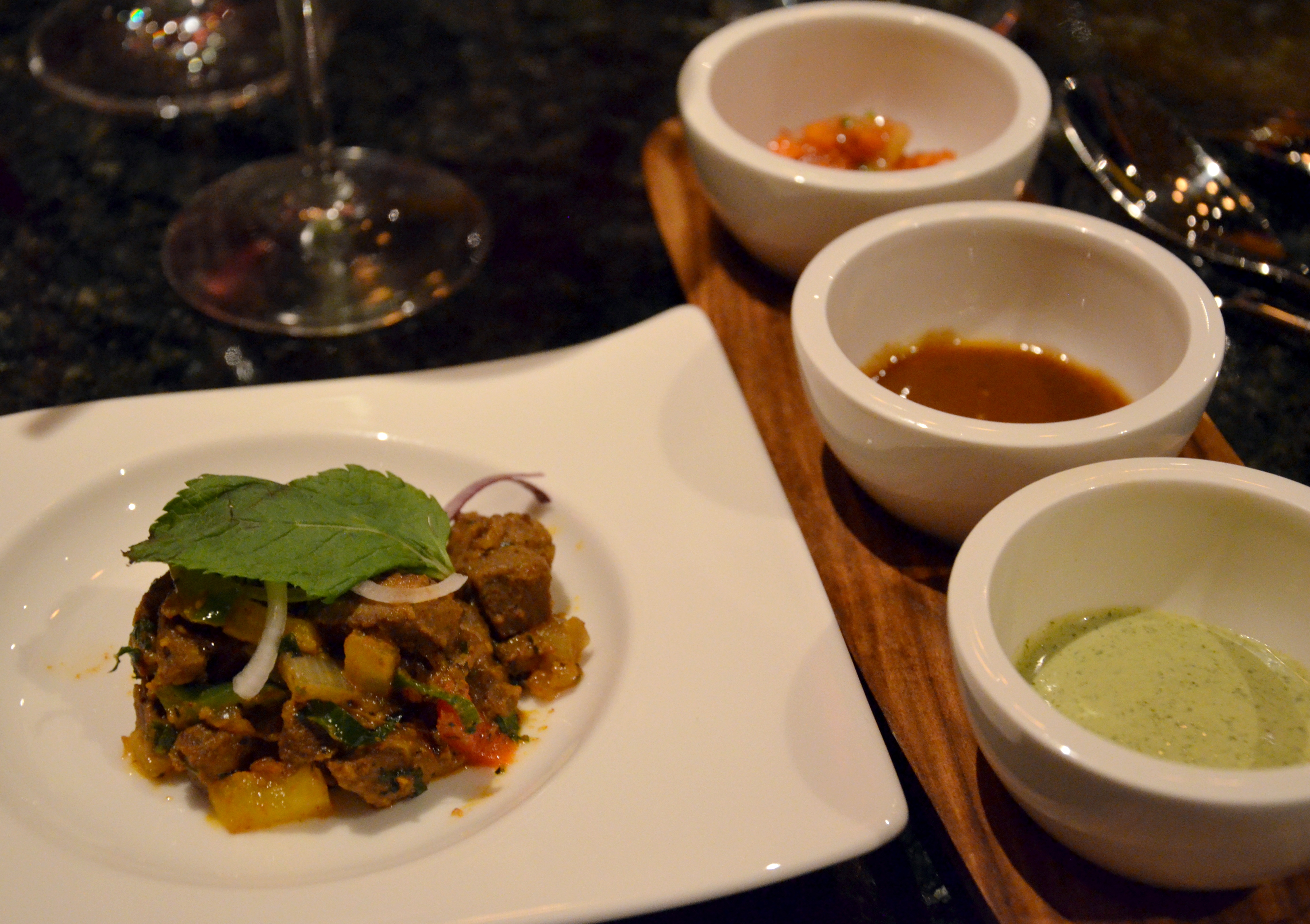 Pudina Lamb Kebab – Marinerat grillad lammfilé med färsk mynta, lime juice, stekt lök, och paprika med kryddor.