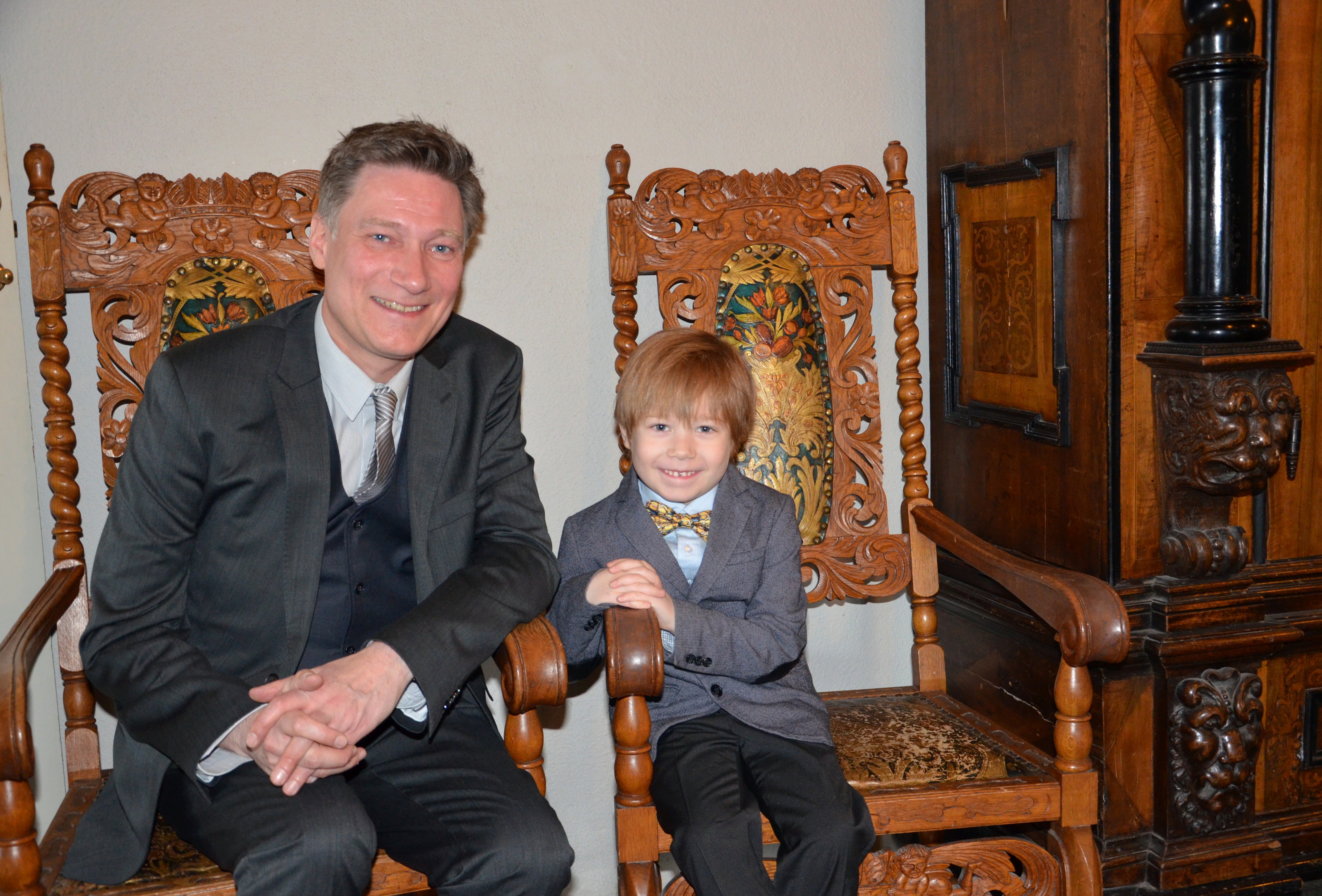 Konsertpianisten Mårten Landström väntar på att framföra en musikalisk hyllning på flygeln, här med sonen Åke.