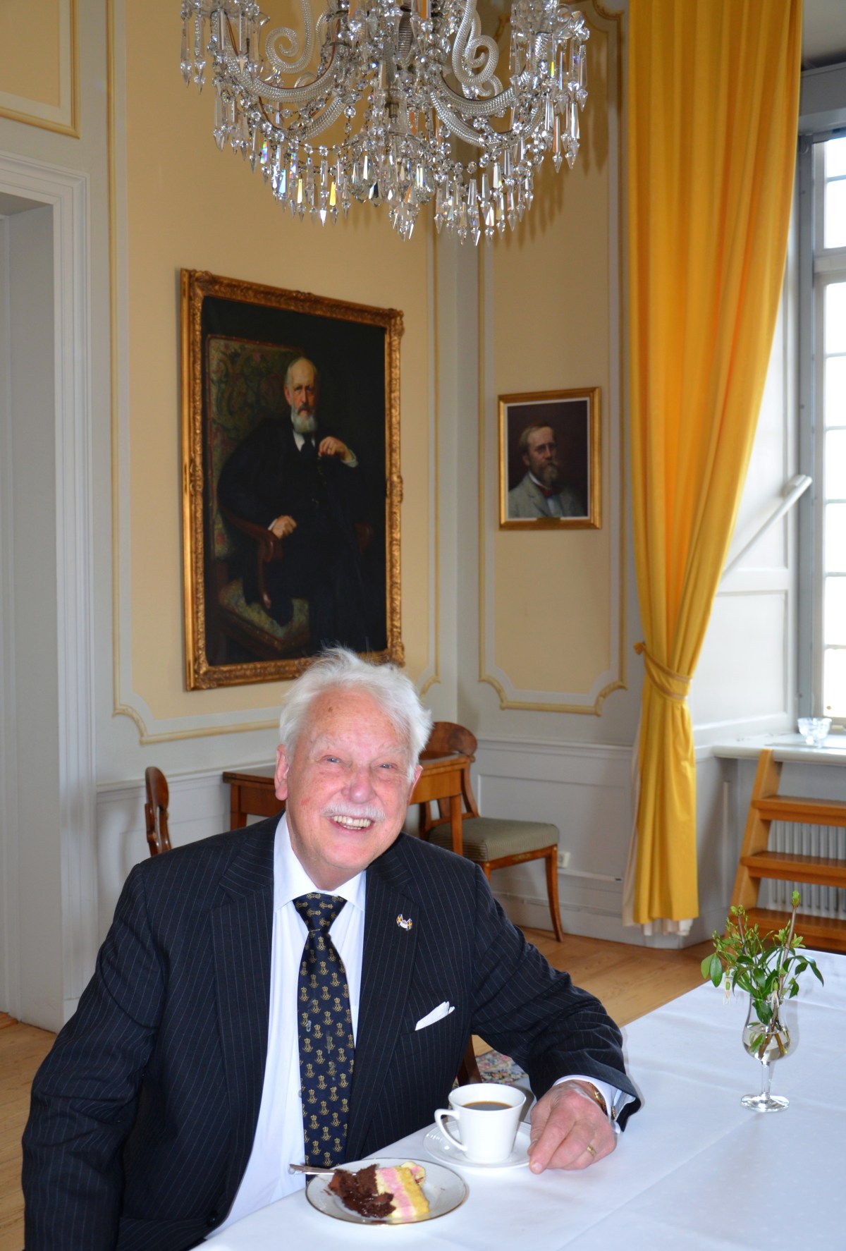 Jubilaren får en stunds avkoppling med en god kopp kaffe och tårta i en av salongerna.