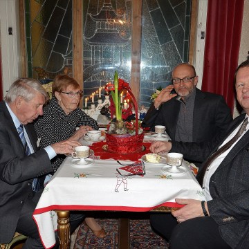 1. 3:e Advent på Villa Solborg. Jorunn och Håkon-Stein Korshavn från Norska kyrkan. Dr. Risto Pakhajärvi och filmproducent Roger Persson.