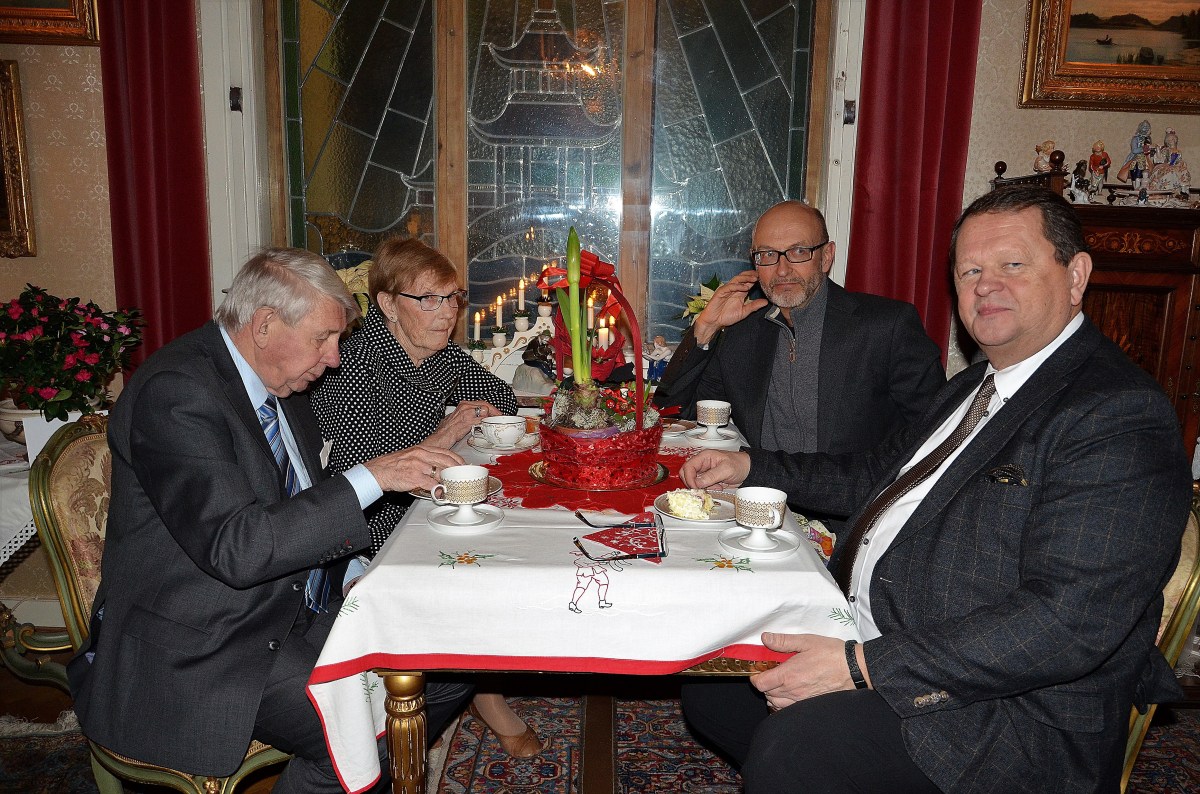 ‘3:e Advent på Villa Solborg. Jorunn och Håkon-Stein Korshavn från Norska kyrkan. Dr. Risto Pakhajärvi och filmproducent Roger Persson.’