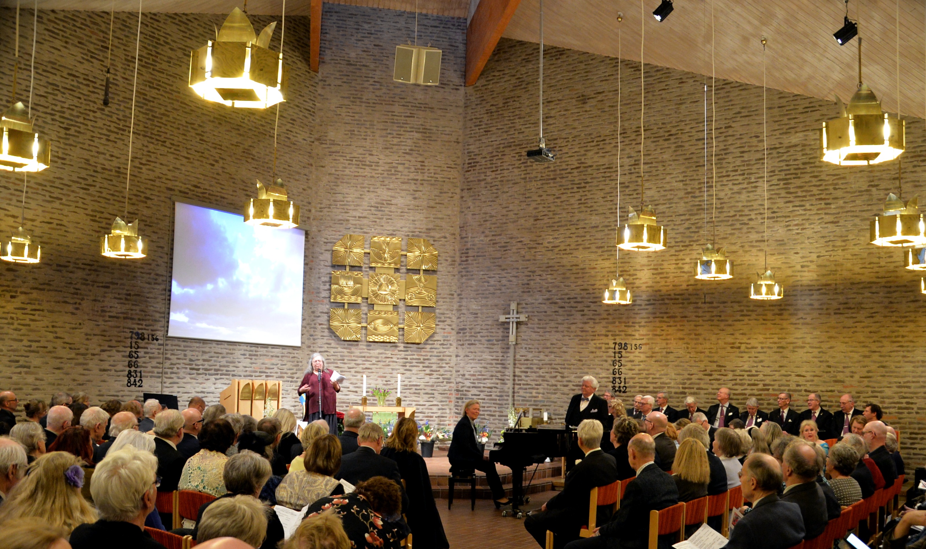 Minneskonsertens presentatör Monica Axelsson presenterar konsertens program och berättar om artisterna och vad de kommer att framföra.