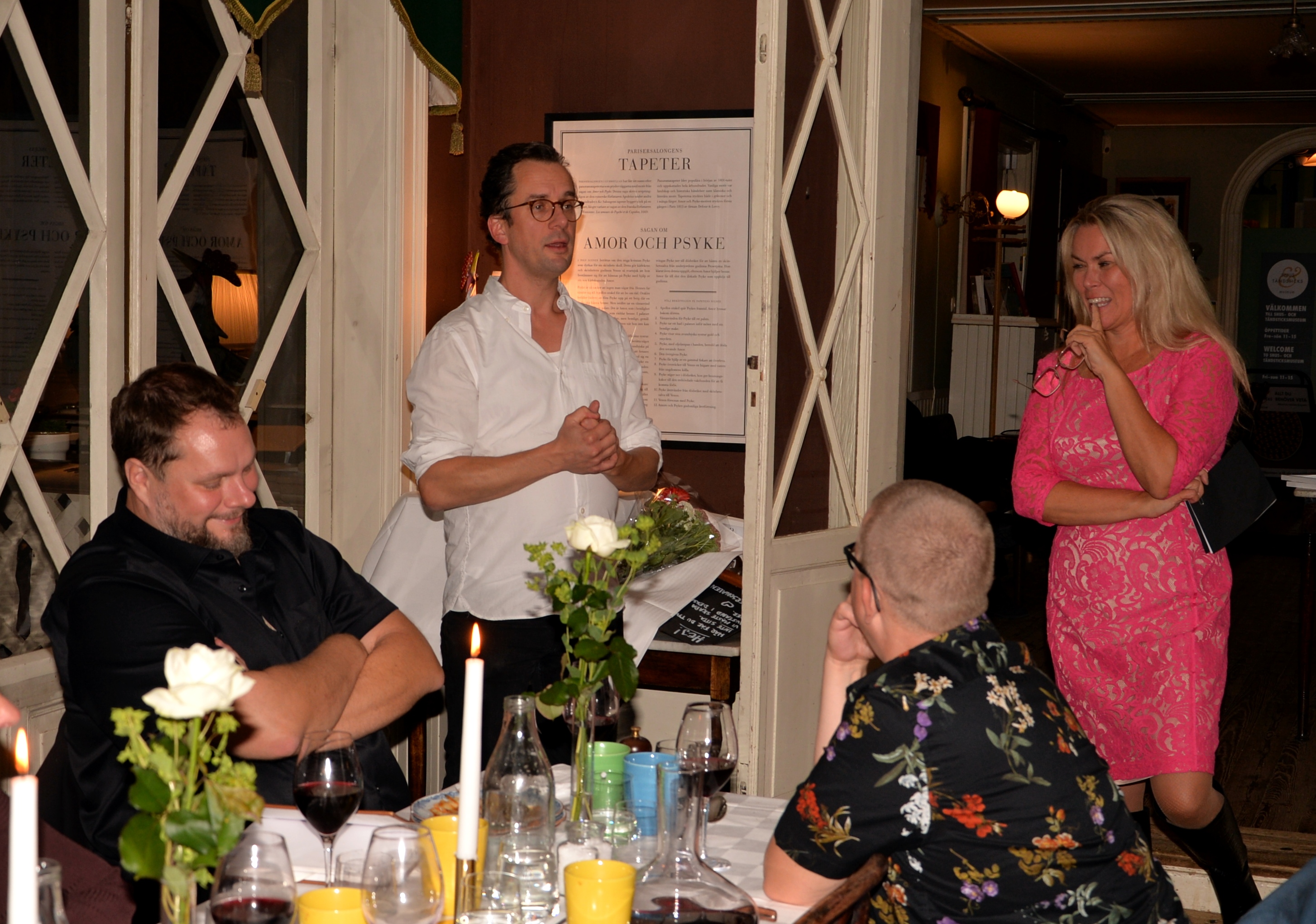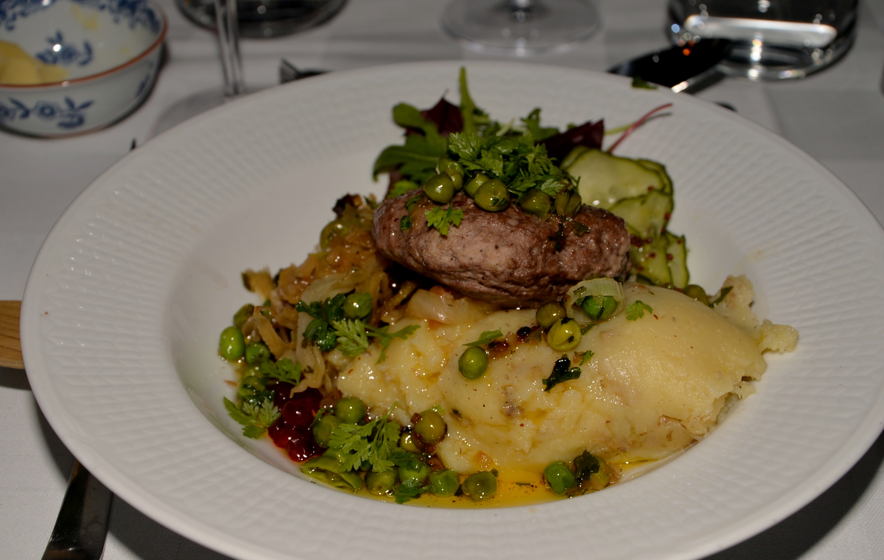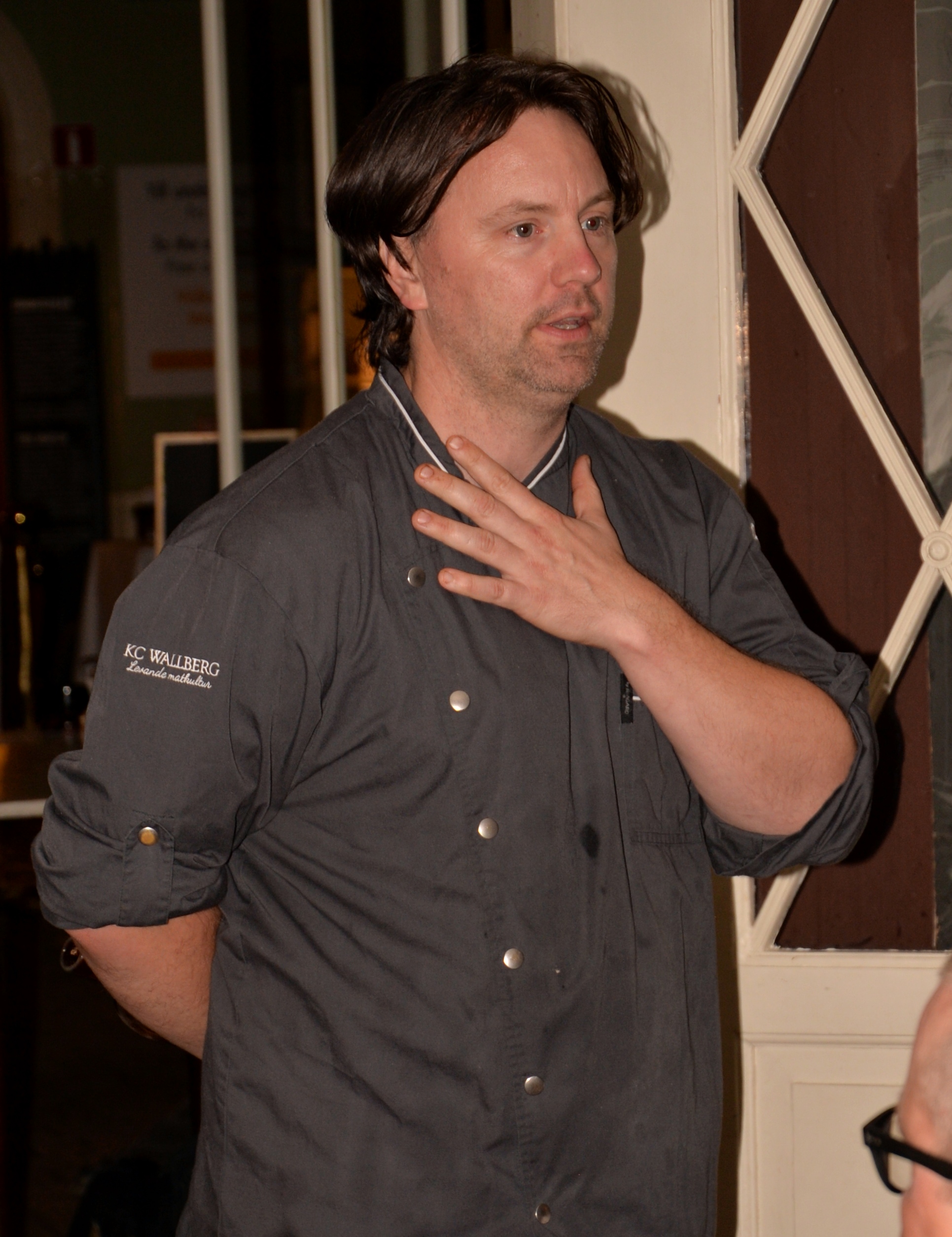 KC Wallberg är sedan 2008 traktör på anrika Restaurang Gubbhyllan. Det ligger på Skansen, som vill visa hela landets mat. De vurmar för det traditionella, svenska köket med alla sina inläggningar och syrningar. De serverar gärna rätter på viltkött, som är vanliga i norr, men firar också typiskt skånska mårtensgås varje år. Kvällens meny var: Viltsvinsbiff med potatismos, lingon och gurksallad. Dessert Glass med drömkaka och nyponsås. Till varmrätten serverades ett glas vin eller alkoholfritt,och till desserten kaffe. Som välkomstdrink serverades ett glas prosecco.