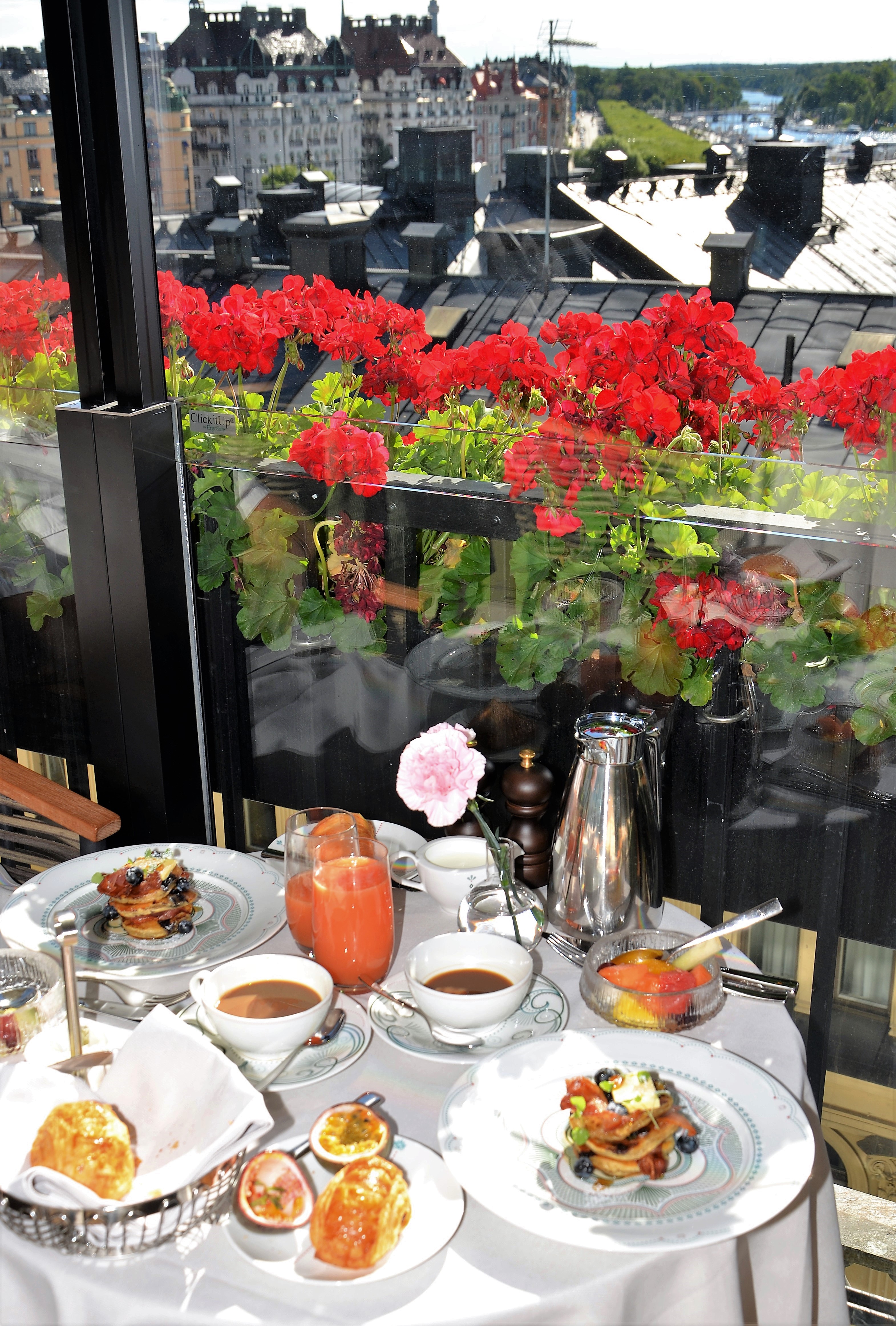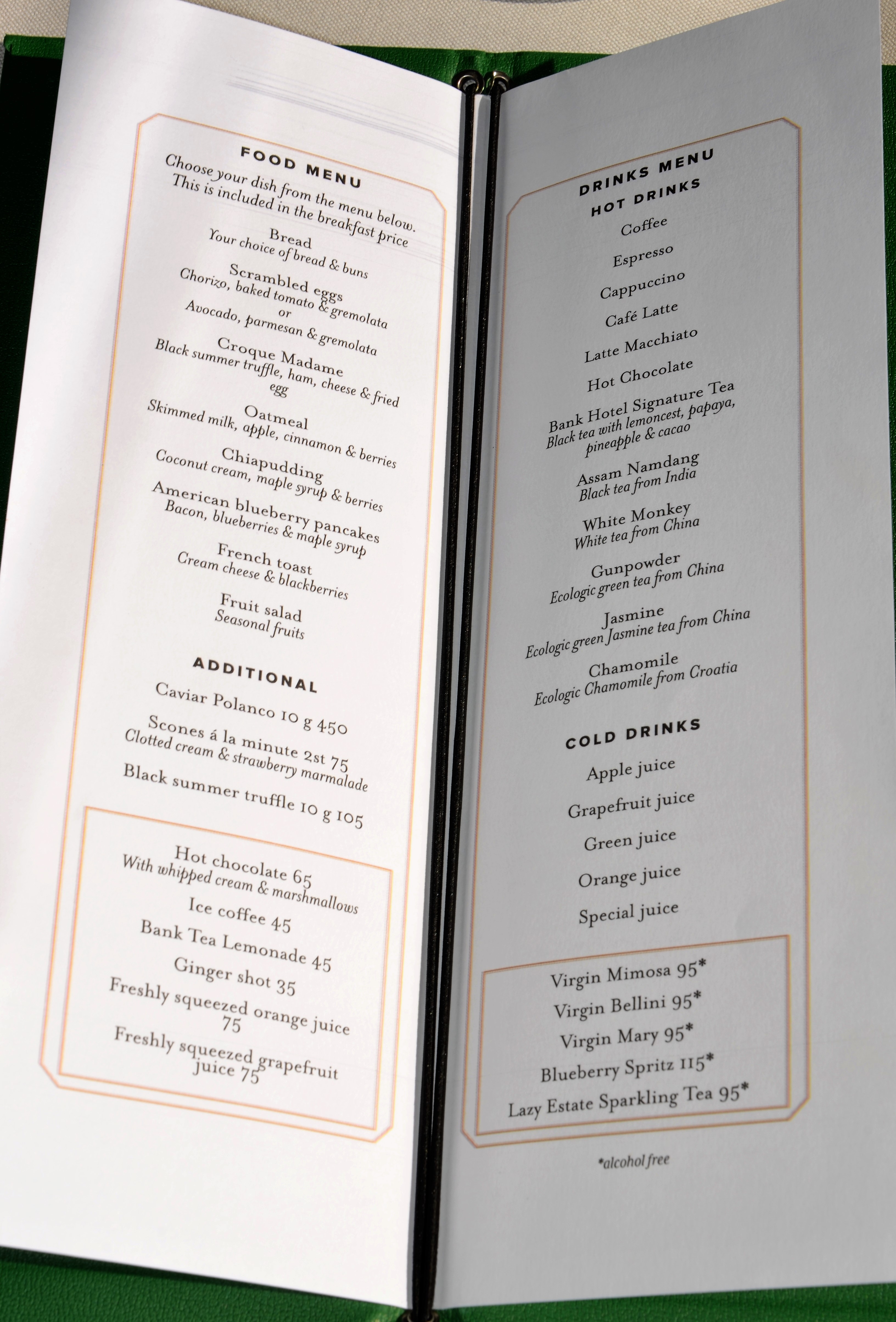 Bank hotel har lanserat ett nytt och unikt frukostkoncept. Executive breakfast för boende i de högre rumskategorierna ebjuder man alternativet att njuta av frukost i rooftop loungen på våning 8. Här serverades en exklusiv à la carte meny till den bästa utsikten över Stockholm och Östermalms takåsar.