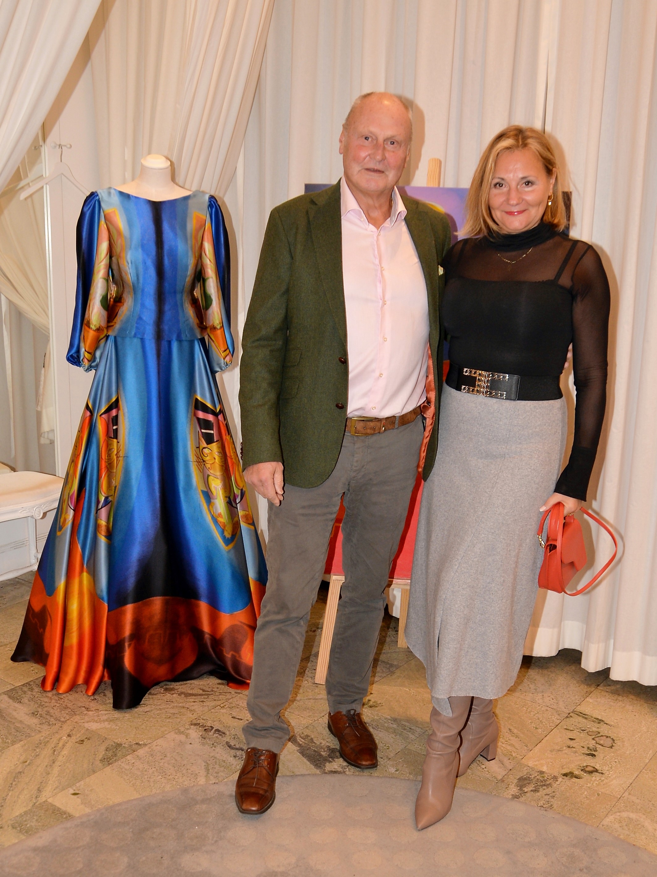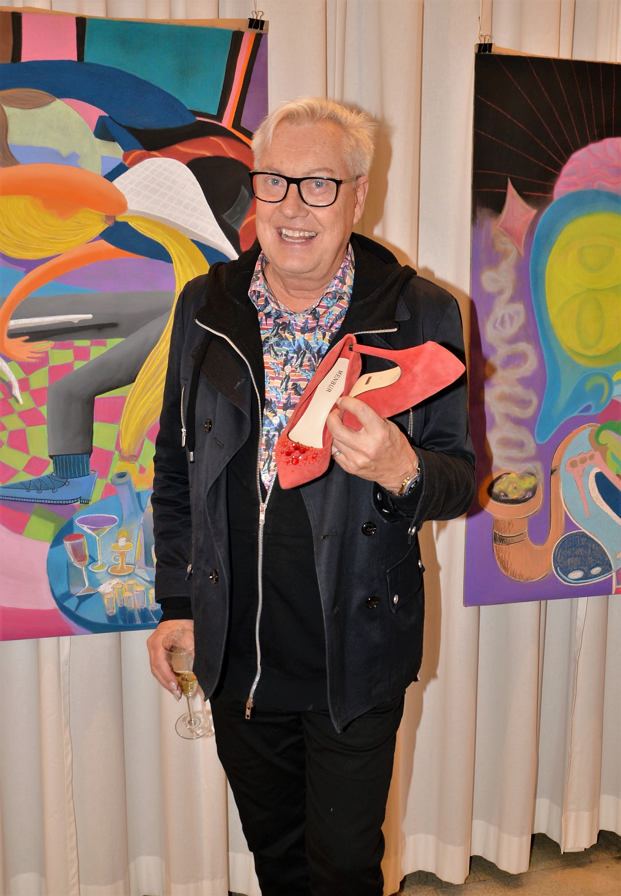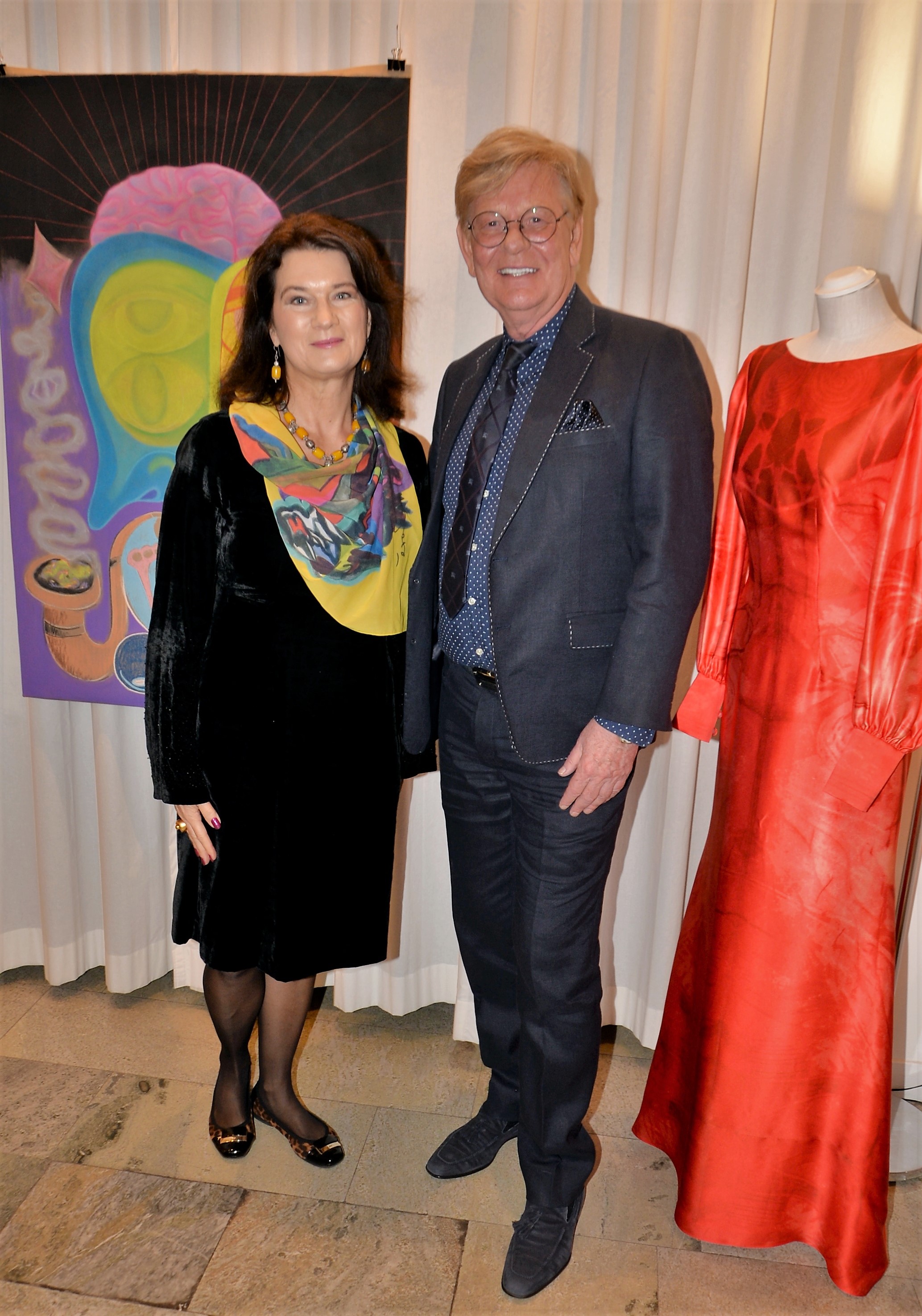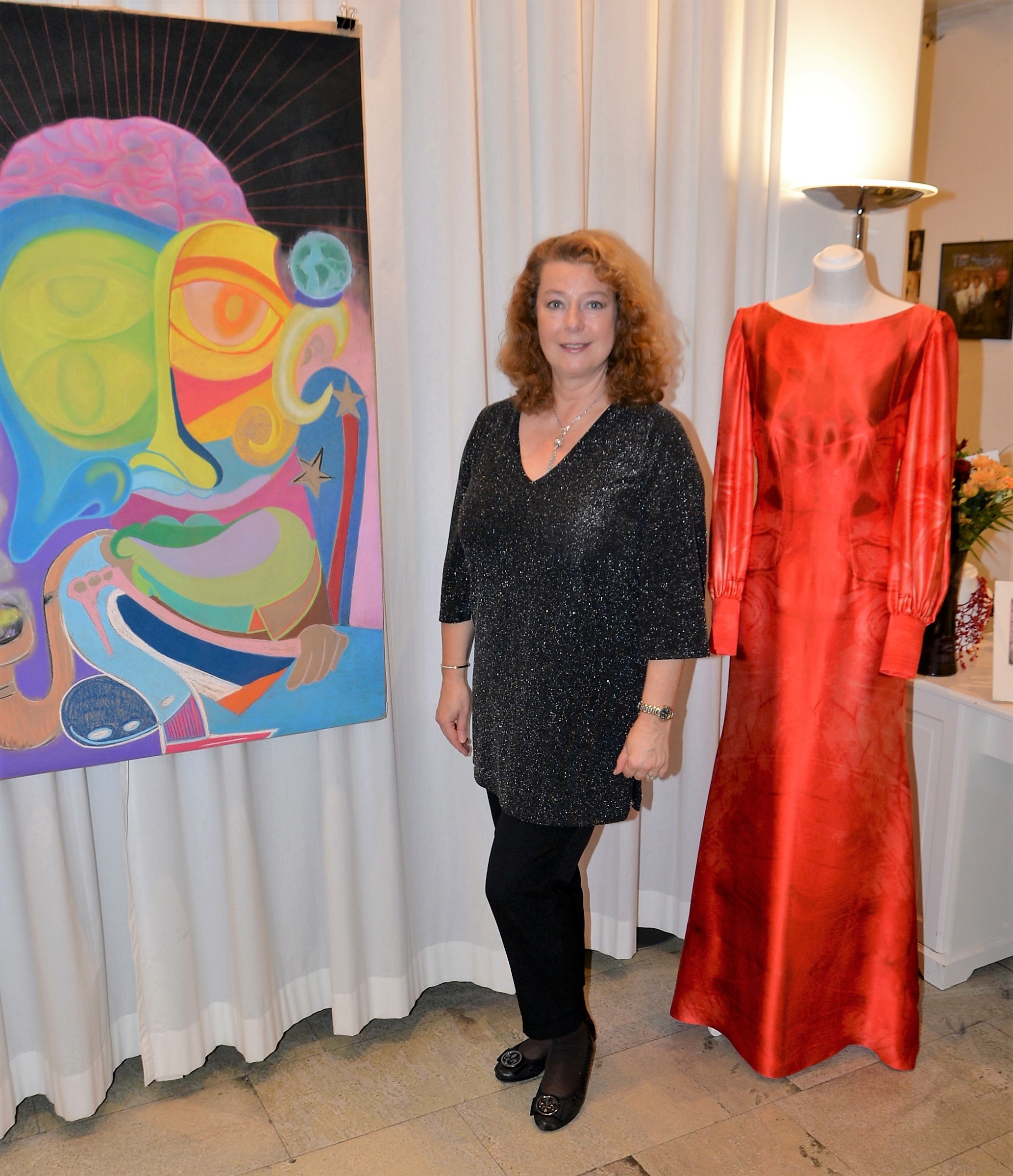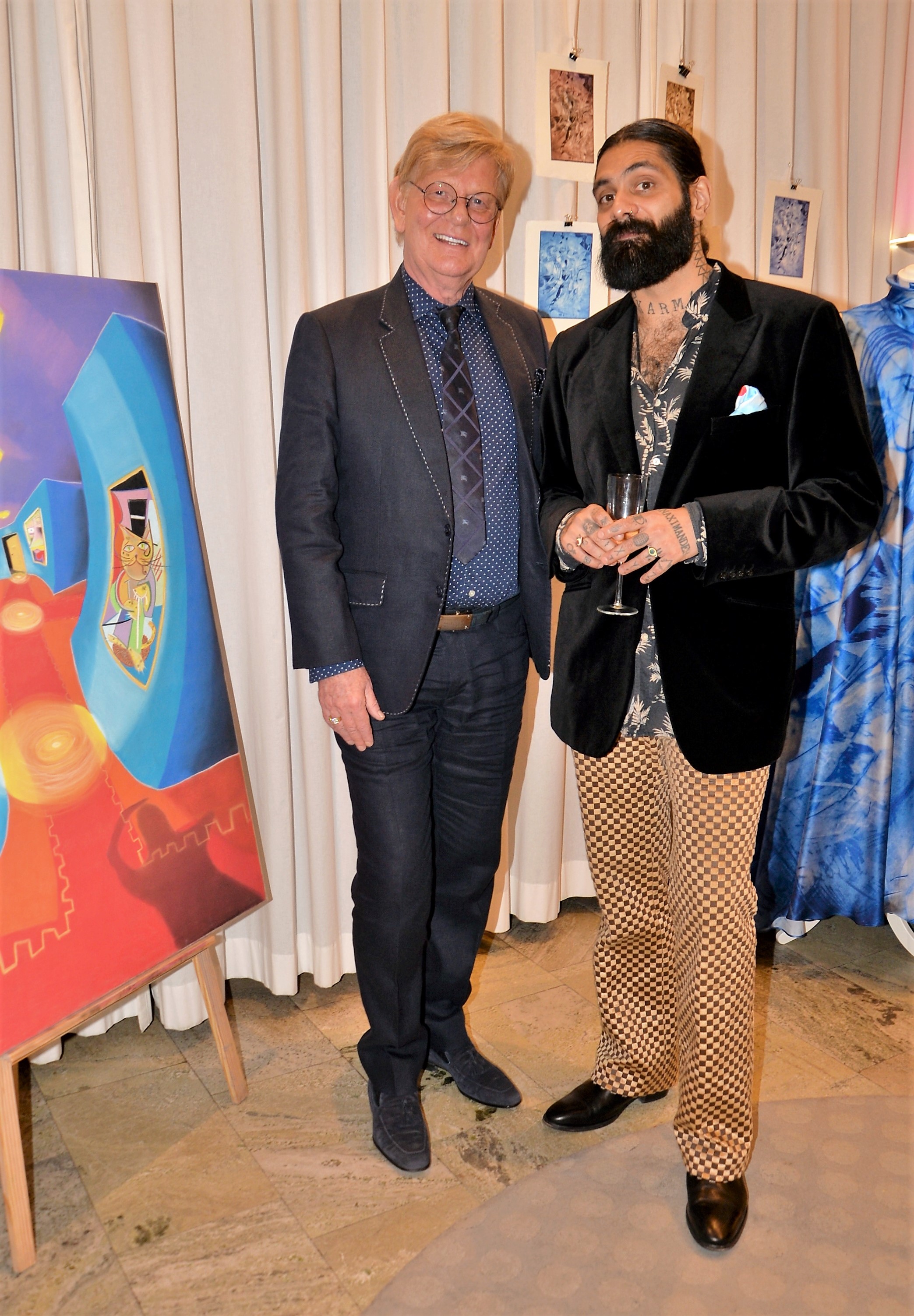Förra årets utställning blev en riktig höjdare och därför bjöd Thalia in för att visa nya verk och plagg. Ateljén är som mitt hem säger legendaren Göran, när han visar upp sina vackra klänningar. Butiken har funnits på Karlavägen 35 år, i mitten av Östermalm. Göran syr upp vad kunden önskar, beställer oftast tyger själv. Alla accessoarer som finns i butiken är handplockade för att passa kläderna. Kvällen var Dennis Duolee‘s andra vernissage med hans konst gjort med krita. Passande till Dennis konst har Göran designat klänningar med nya matchande mönster.