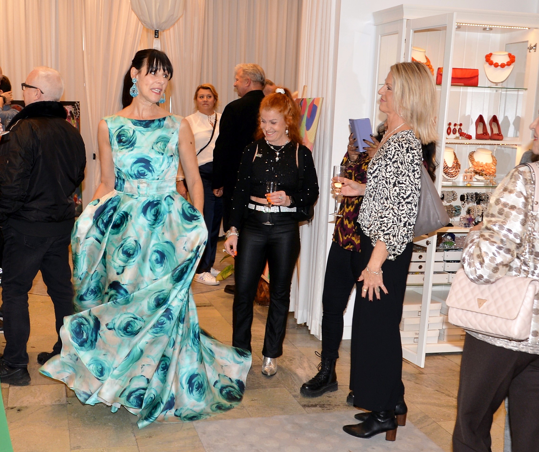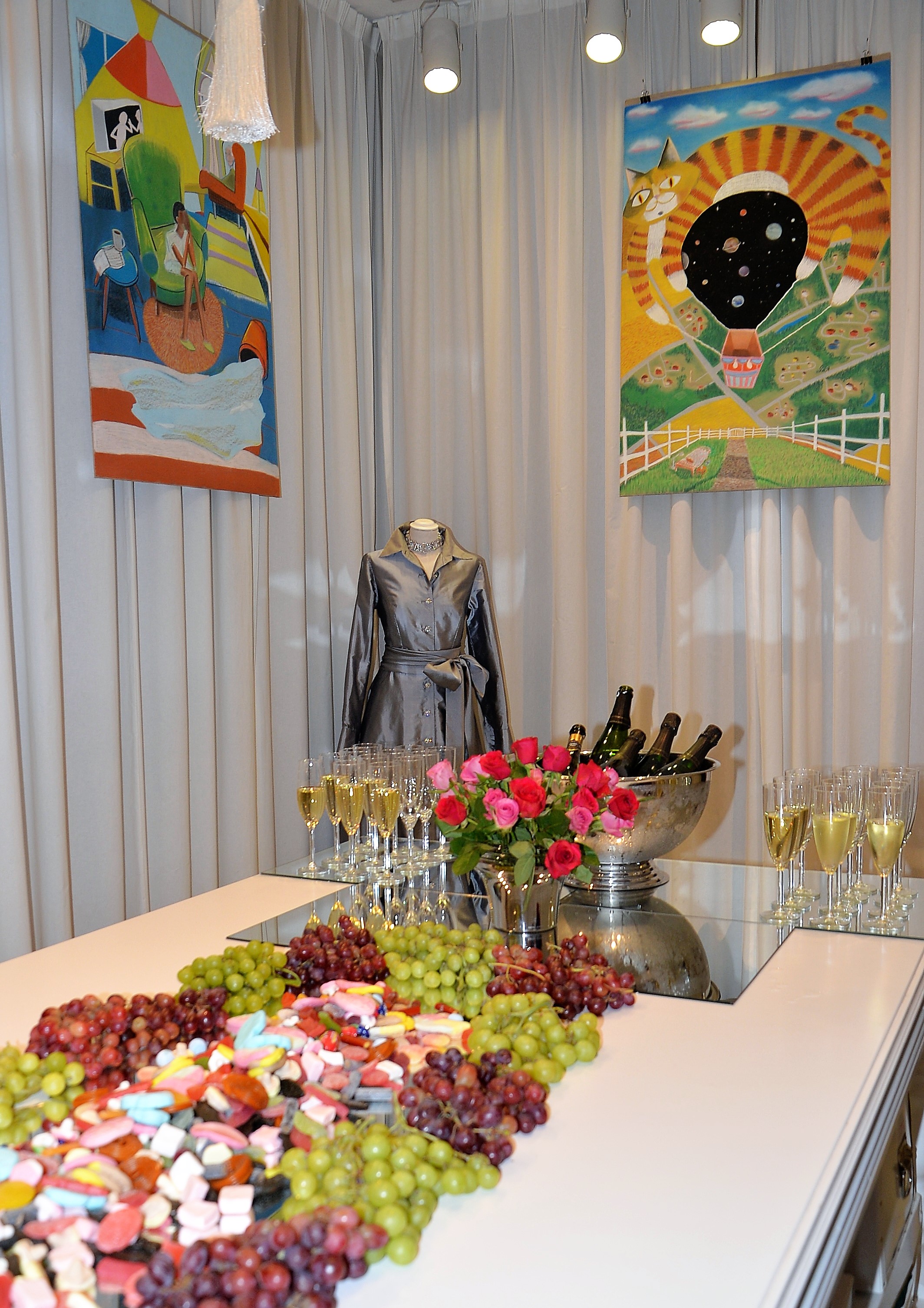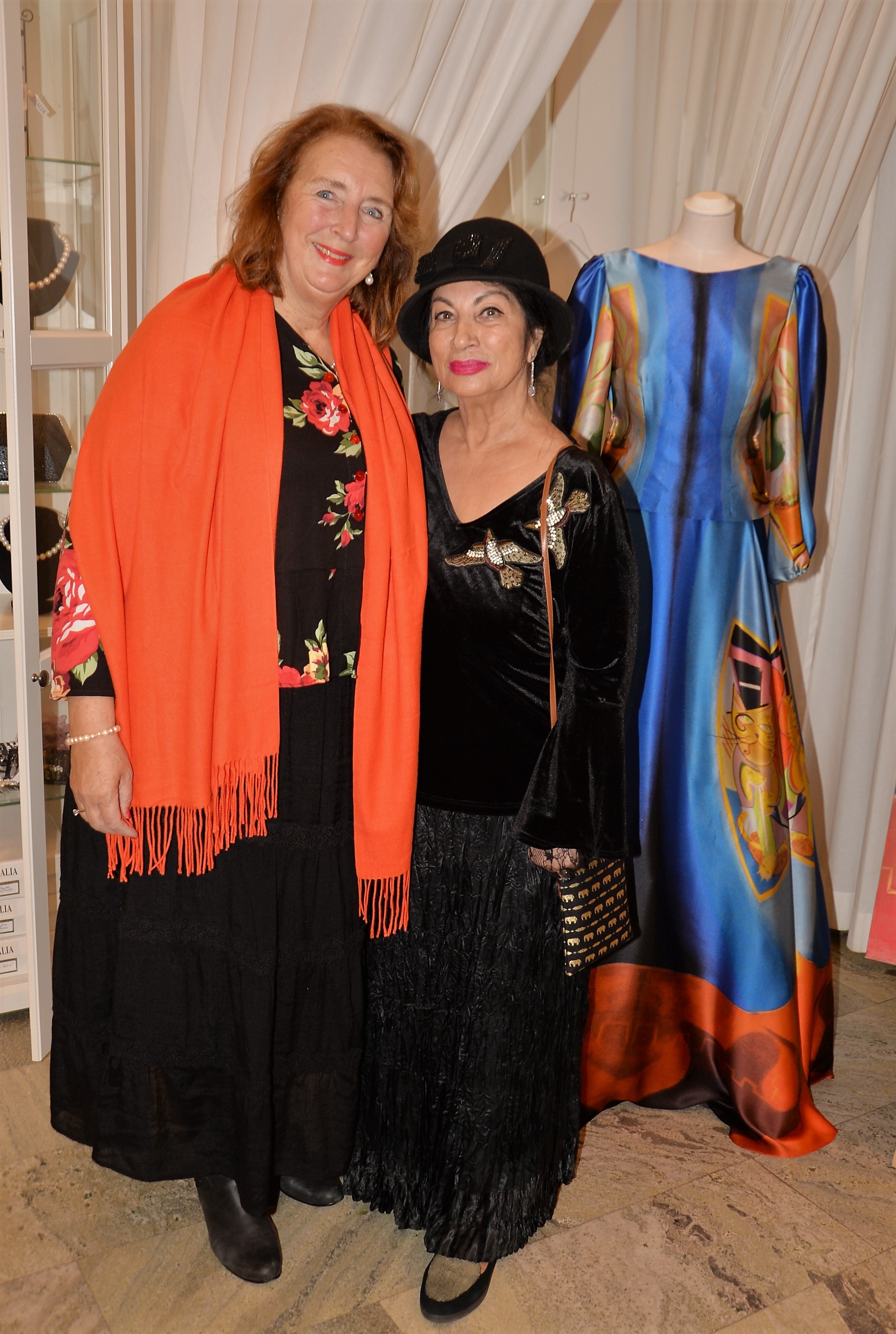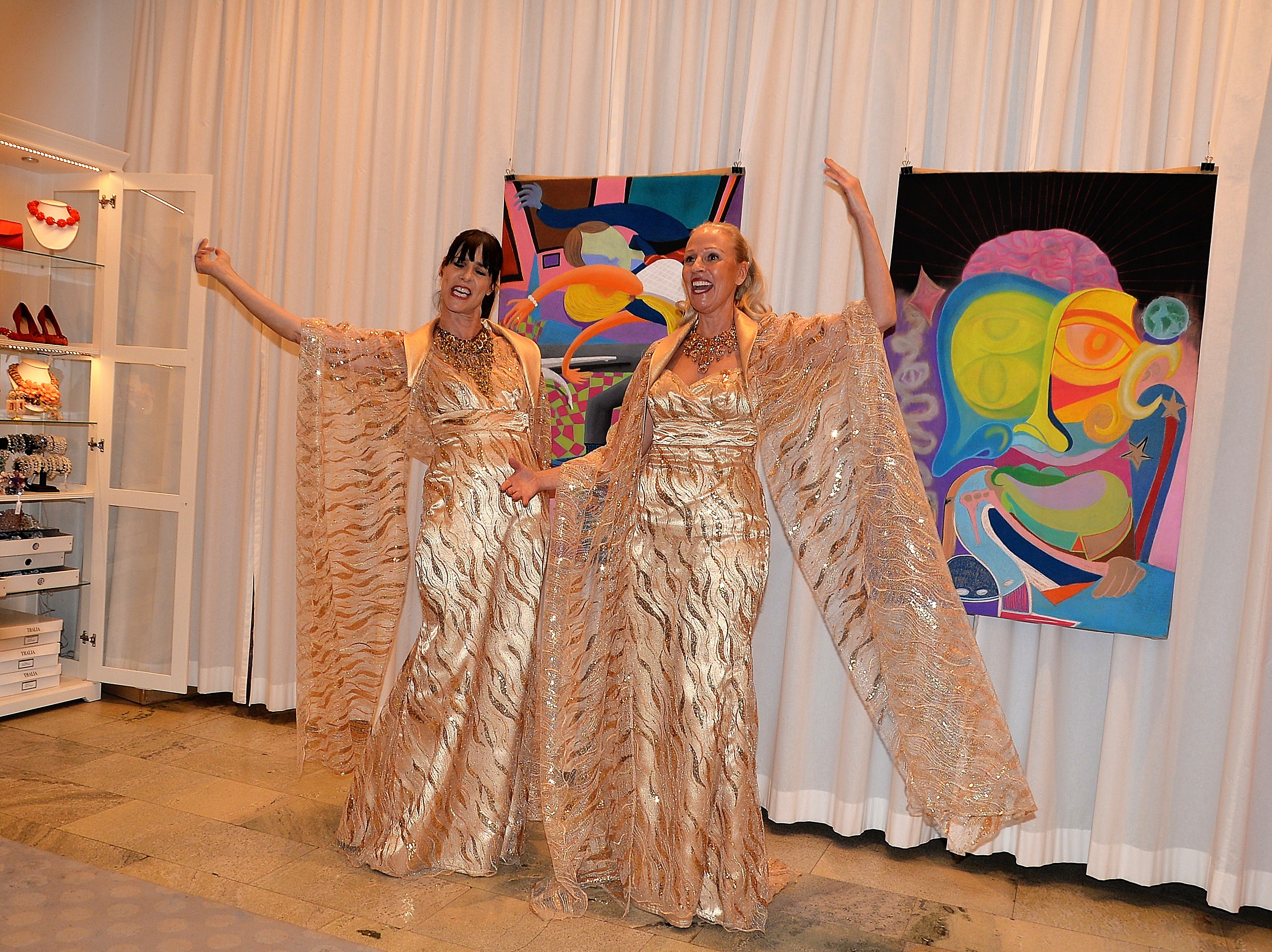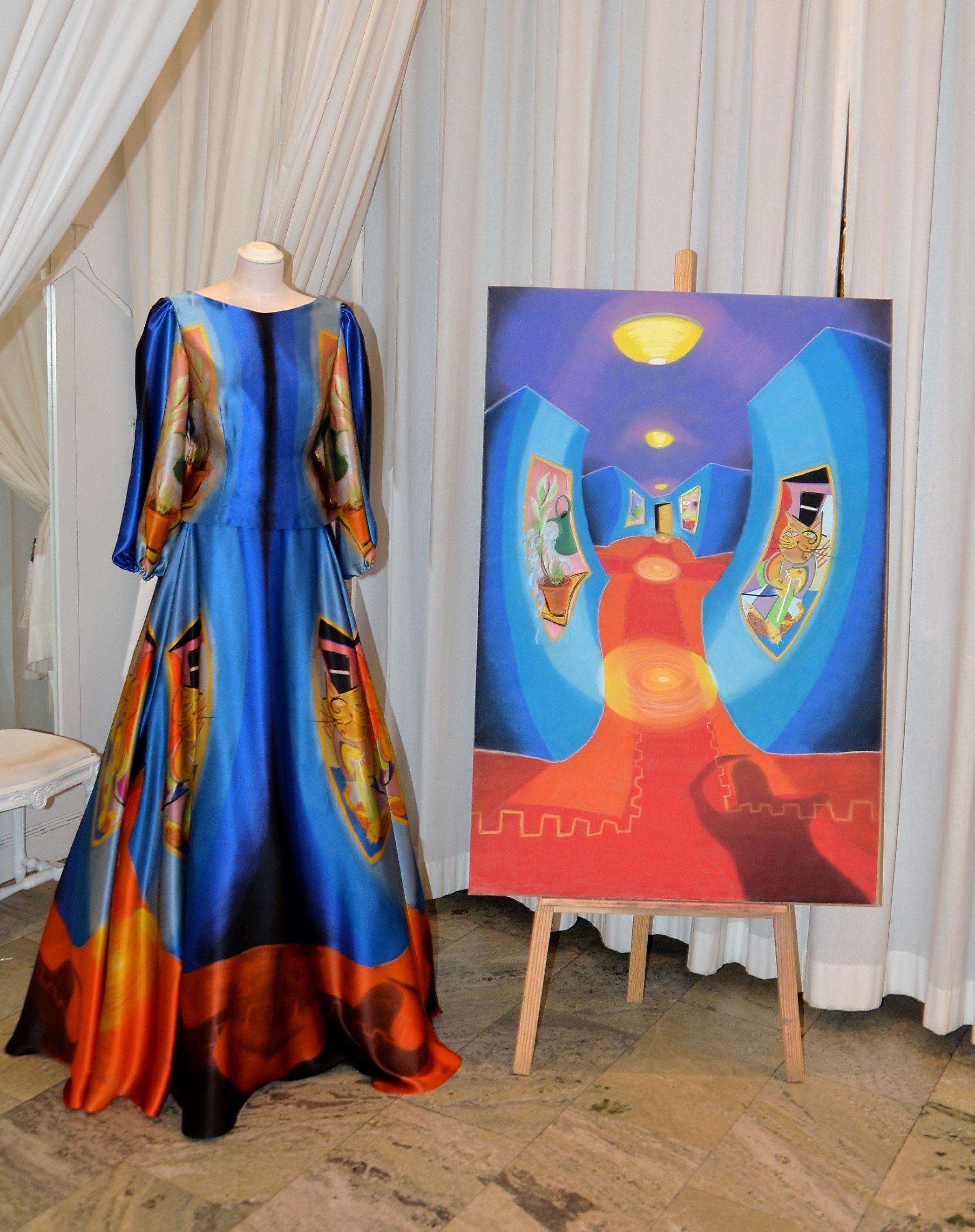 Förra årets utställning blev en riktig höjdare och därför bjöd Thalia in för att visa nya verk och plagg. Ateljén är som mitt hem säger legendaren Göran, när han visar upp sina vackra klänningar. Butiken har funnits på Karlavägen 35 år, i mitten av Östermalm. Göran syr upp vad kunden önskar, beställer oftast tyger själv. Alla accessoarer som finns i butiken är handplockade för att passa kläderna. Kvällen var Dennis Duolee‘s andra vernissage med hans konst gjort med krita. Passande till Dennis konst har Göran designat klänningar med nya matchande mönster.