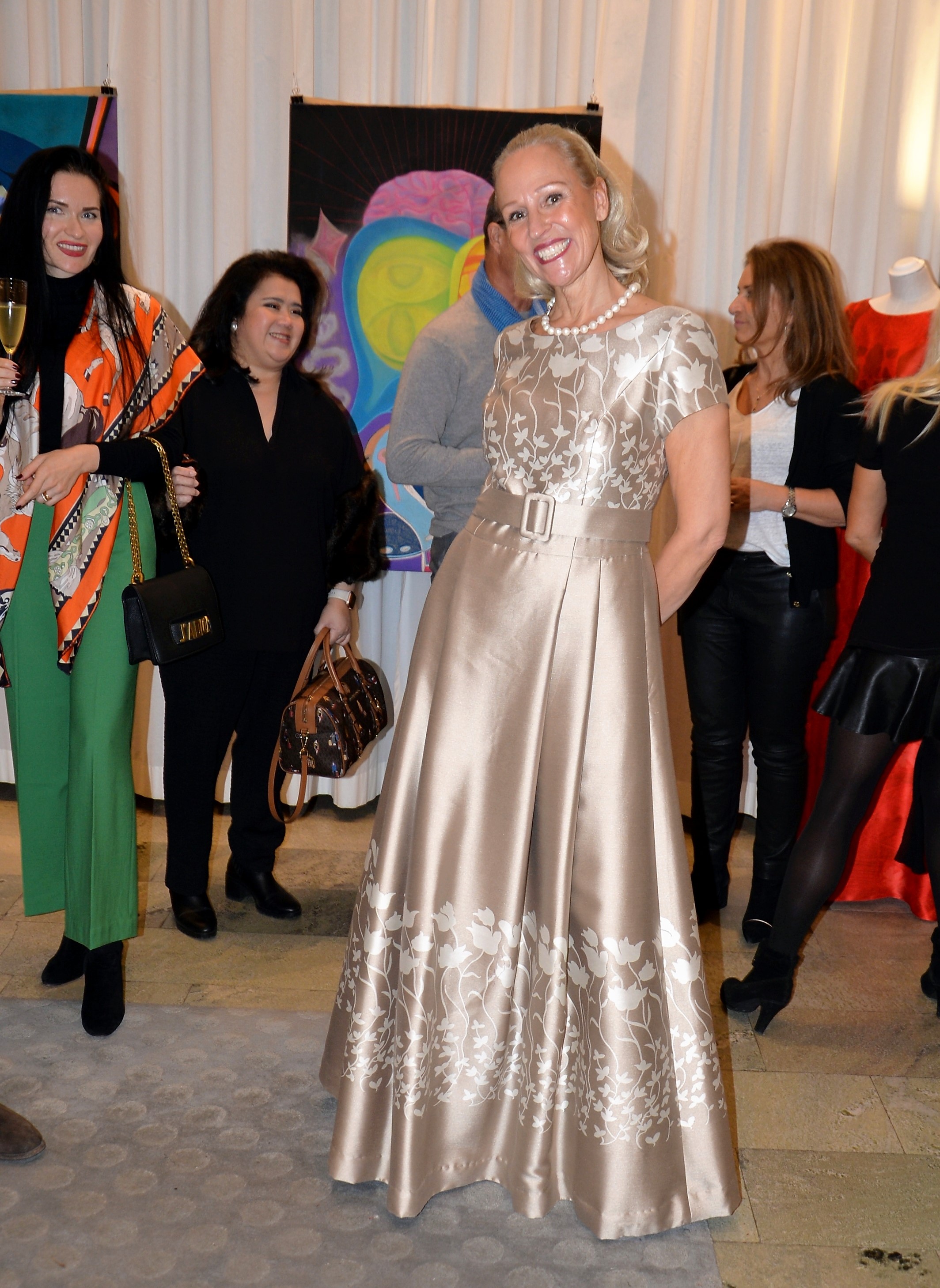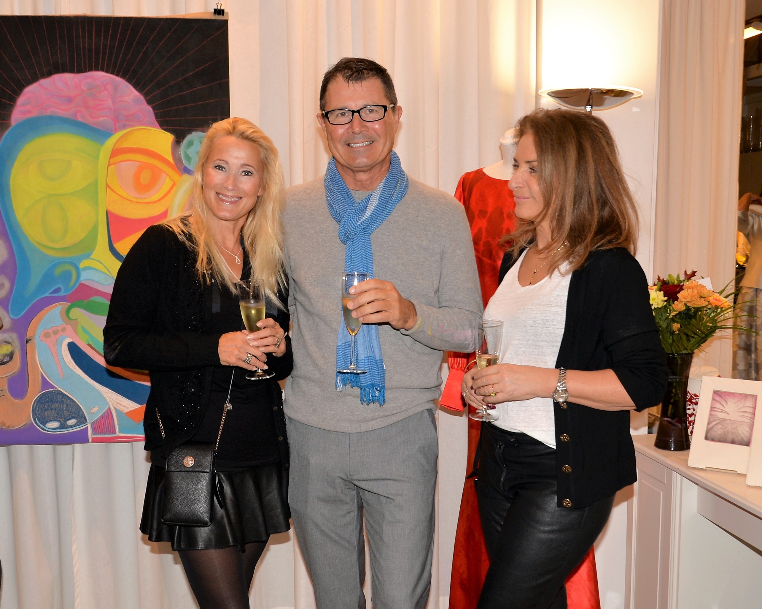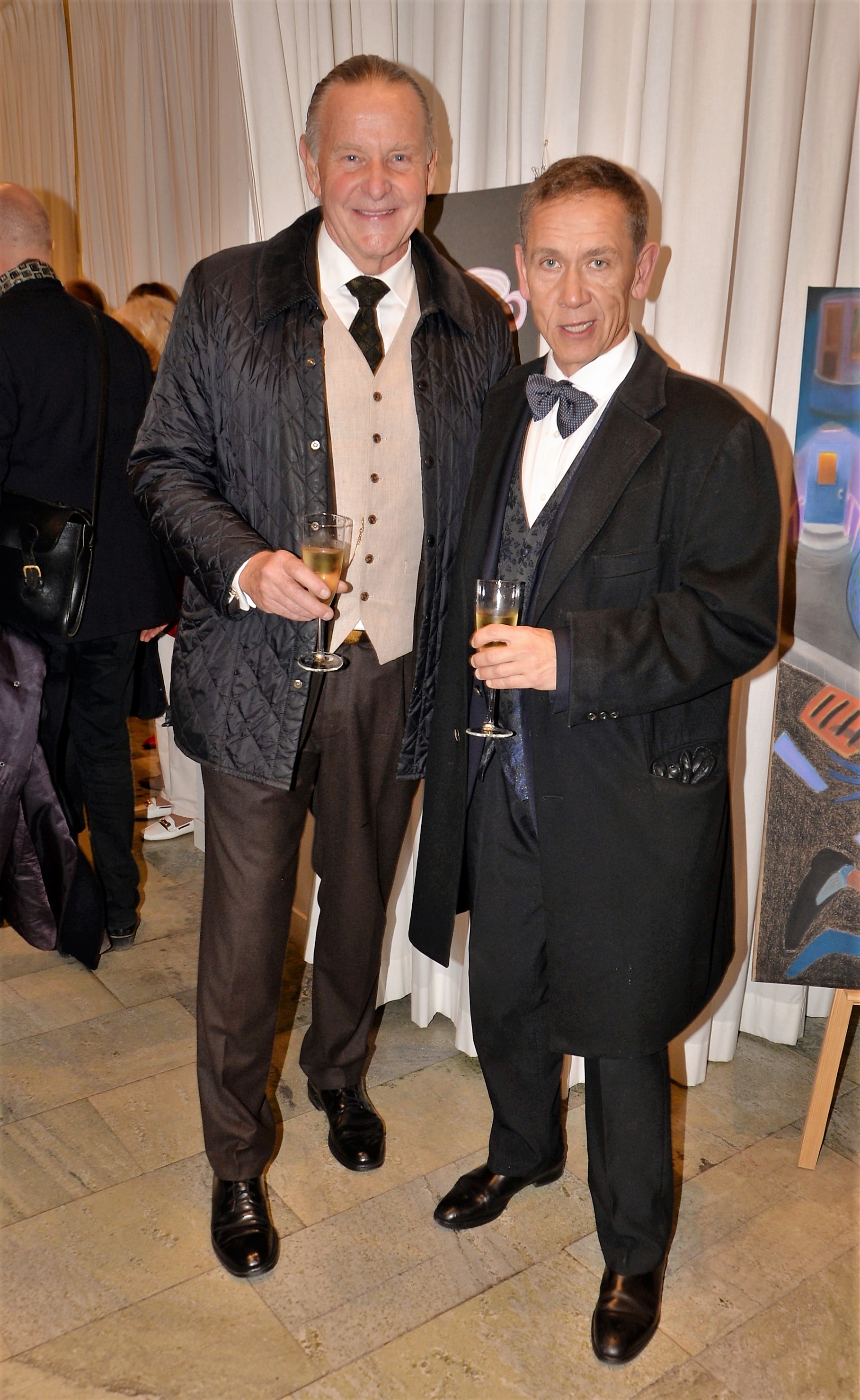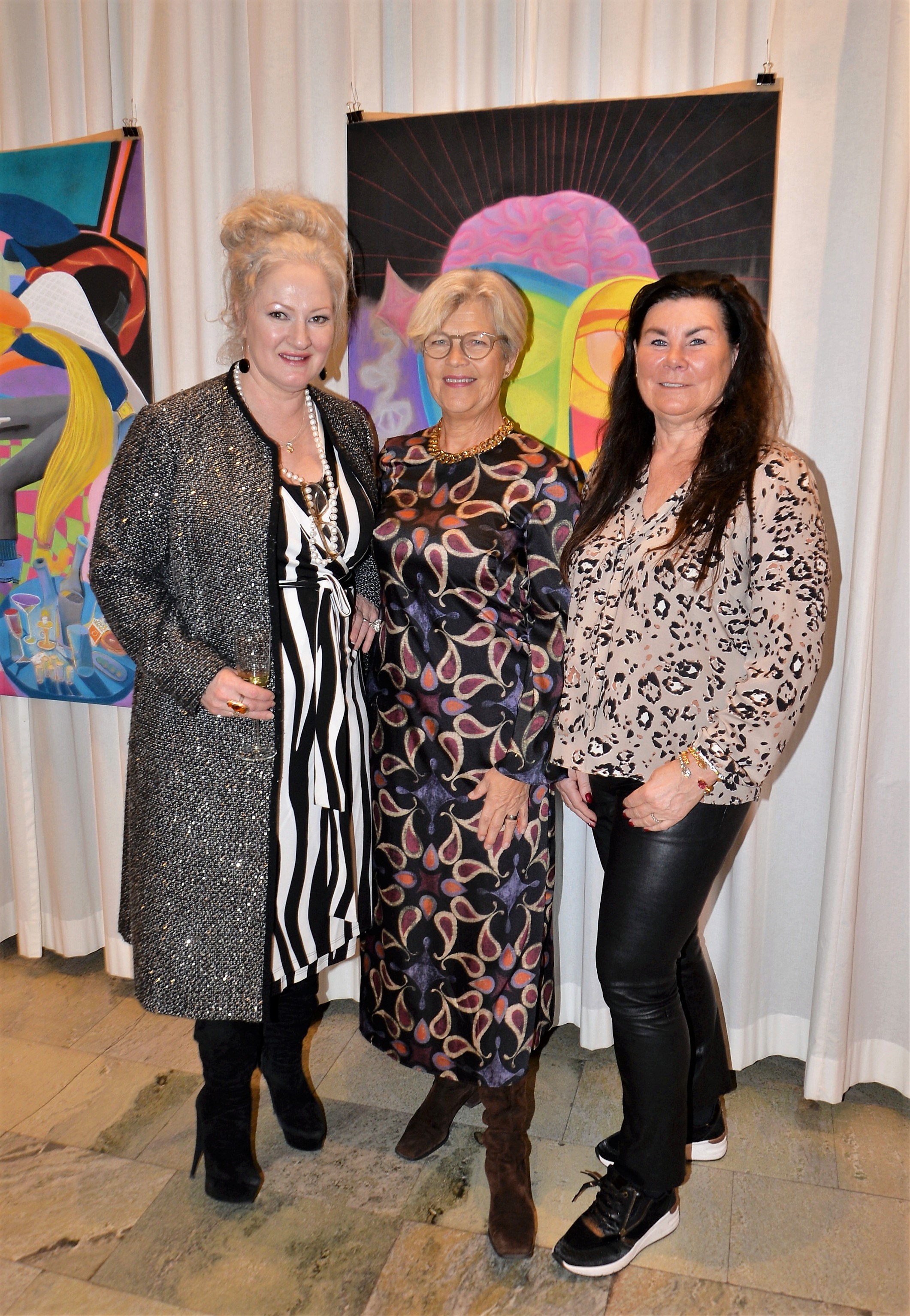 Förra årets utställning blev en riktig höjdare och därför bjöd Thalia in för att visa nya verk och plagg. Ateljén är som mitt hem säger legendaren Göran, när han visar upp sina vackra klänningar. Butiken har funnits på Karlavägen 35 år, i mitten av Östermalm. Göran syr upp vad kunden önskar, beställer oftast tyger själv. Alla accessoarer som finns i butiken är handplockade för att passa kläderna. Kvällen var Dennis Duolee‘s andra vernissage med hans konst gjort med krita. Passande till Dennis konst har Göran designat klänningar med nya matchande mönster.