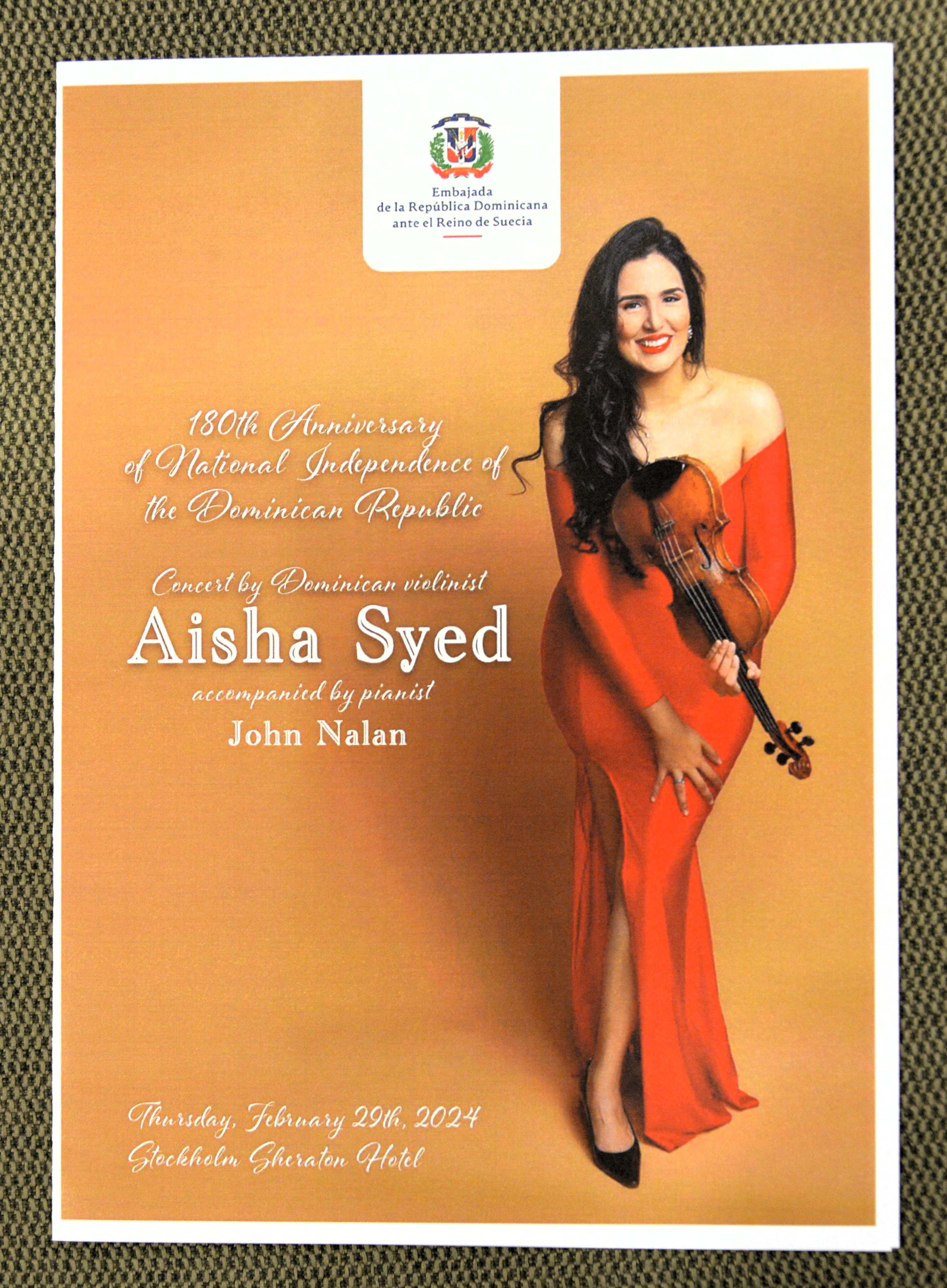 Reception on the occasion of the 180th Anniversary of the National Independence of the Dominican Republic, was held on 29th February at the Sheraton hotel in Stockholm, Sweden. Performance by Aisha Syed, with pianist John Nalan. See Cawa Media’s pictures below…