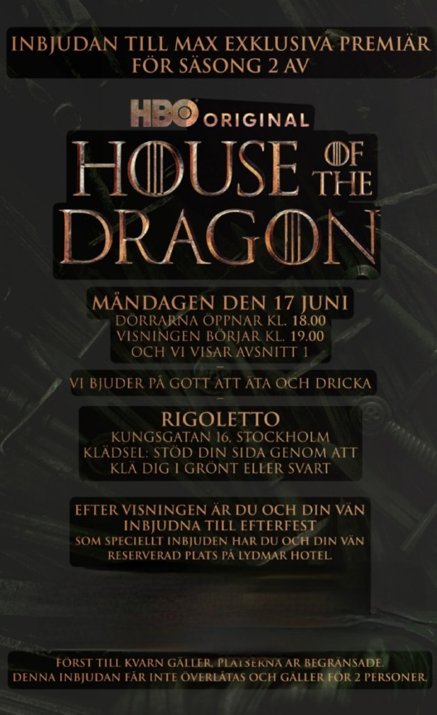 MAX EXKLUSIVA PREMIÄR FÖR SÄSONG 2 AV HOUSE OF THE DRAGON MÅNDAGEN DEN 17 JUNI BIOGRAF RIGOLETTO, STOCKHOLM