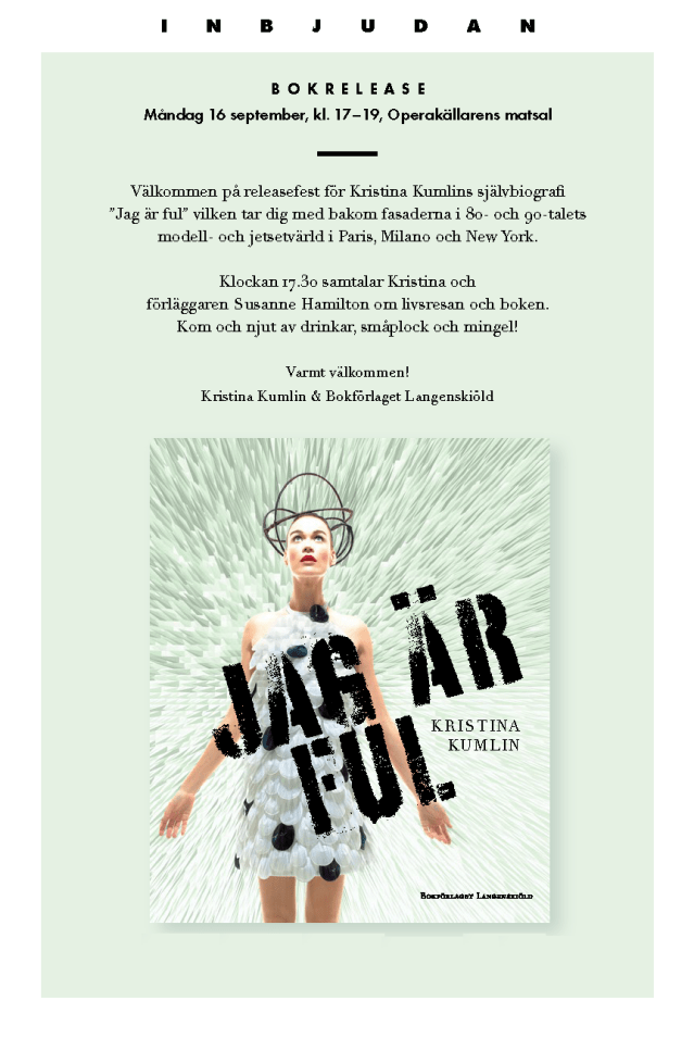 Den stora releasefesten för Kristina Kumlins självbiografi ’’Jag är ful’’. Boken tar dig med bakom fasaderna i 80- och 90-talets modell- och jetsetvärld i Paris, Milano och New York.