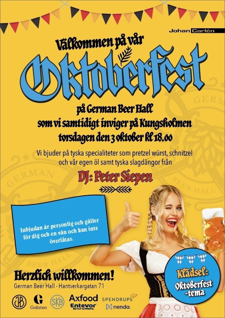 Oktoberfesten 2024 på German Beer Hall på Hantverkargatan 71. Johan Carlén bjöd in till en stor fest med mycket sång och musik! Många kom med tyrolerkostymer i rött, vitt, svart, stövlar, med god stämning, med ett stort leende och i härlig feststämning. Alla fick även prova hattar, och fick träffa många underbara människor, smaka härlig tysk mat, dricka mycket öl. DJ Peter Siepen spelade härlig tysk musik, och det blev singalong ifrån publiken.