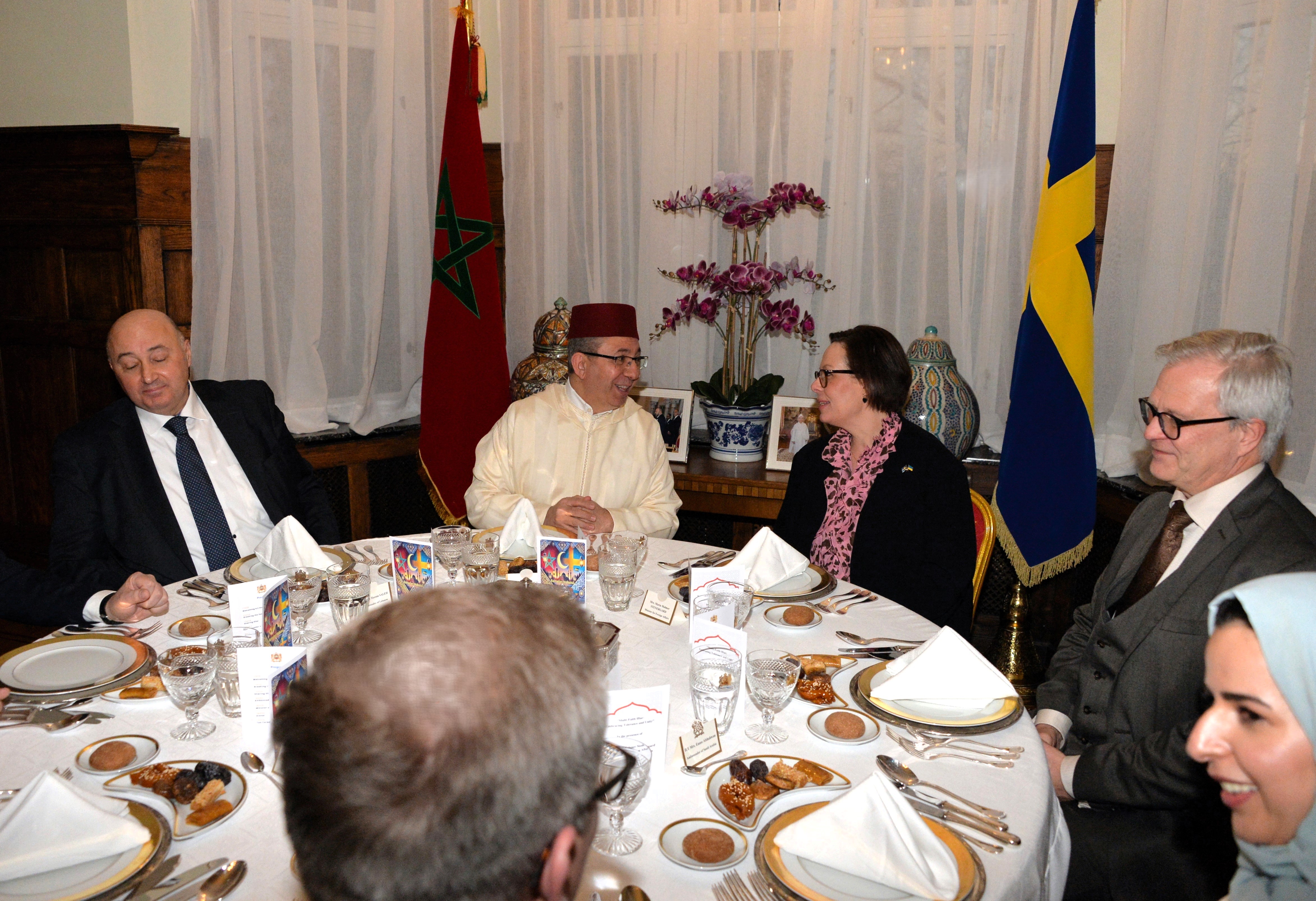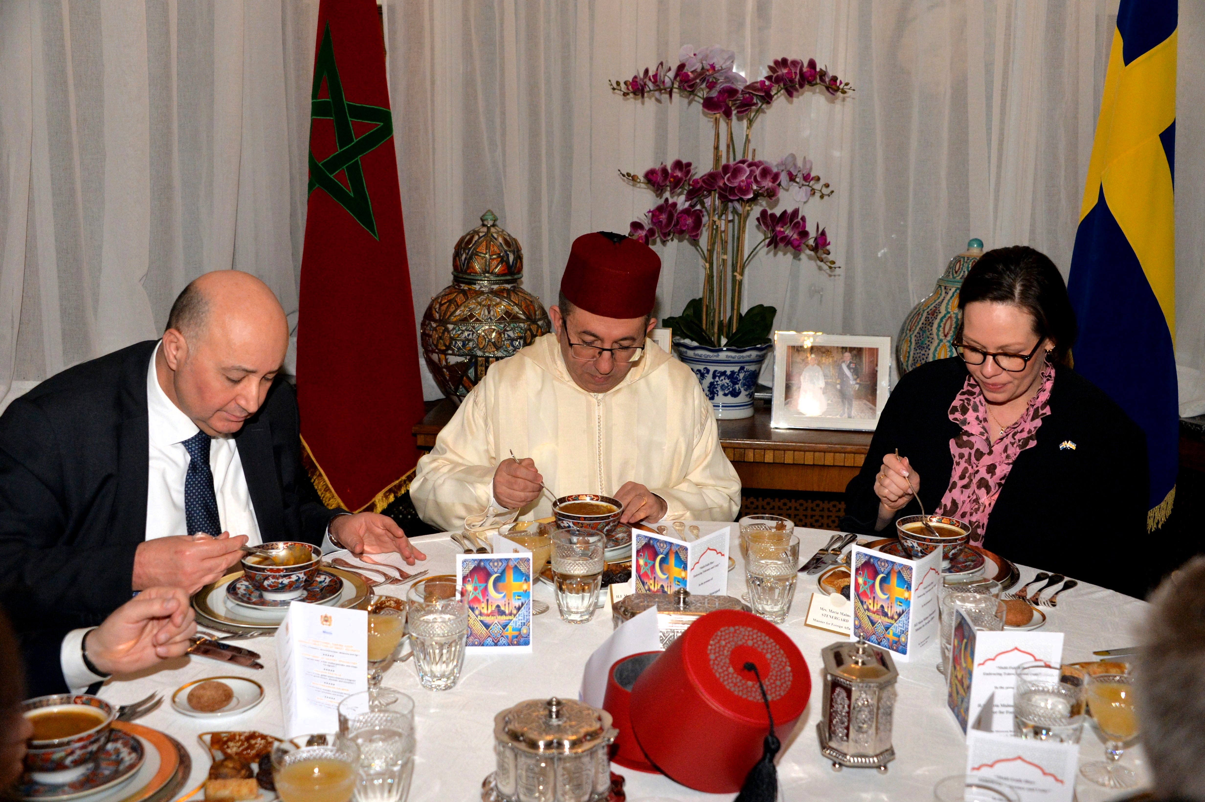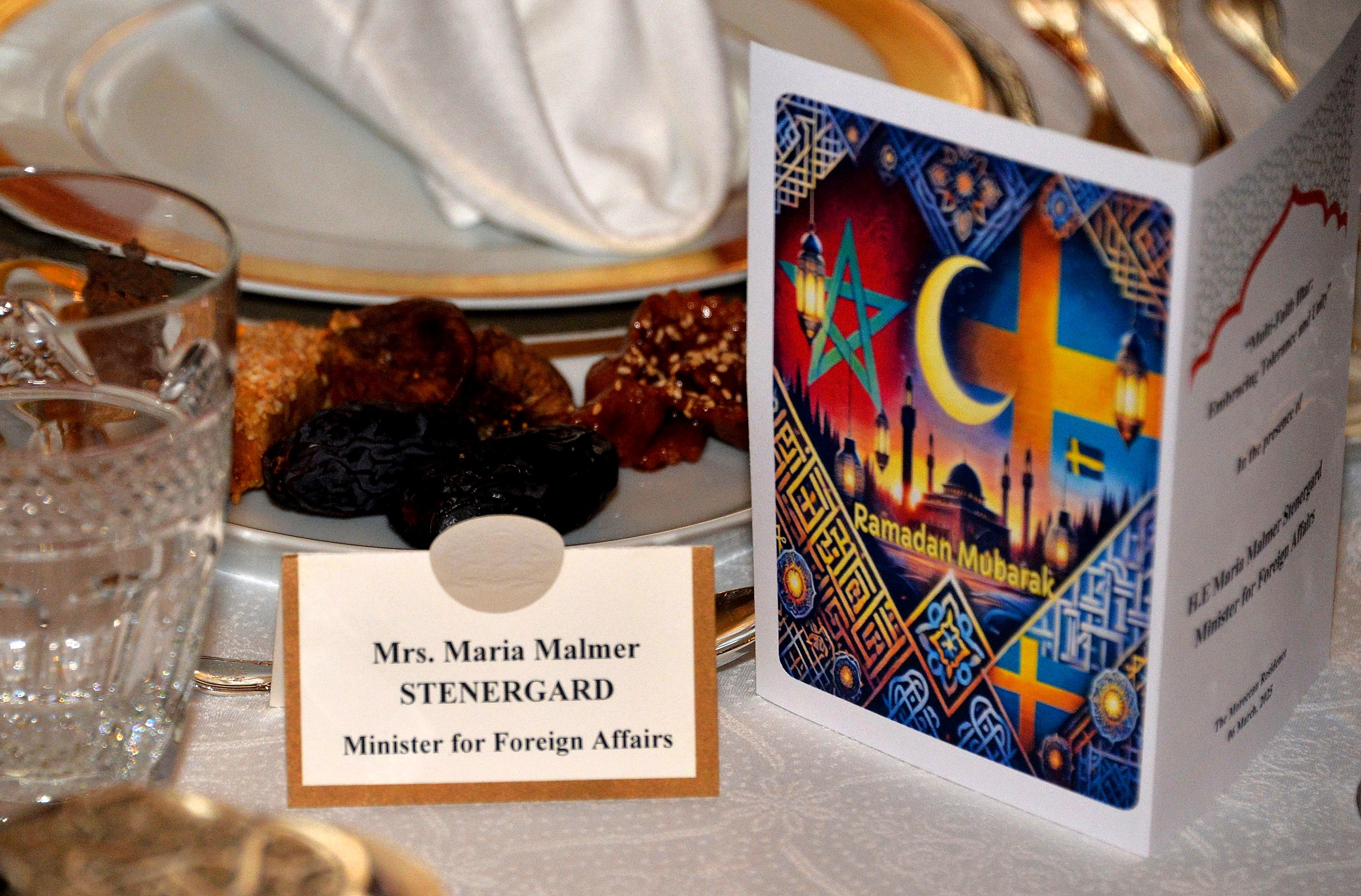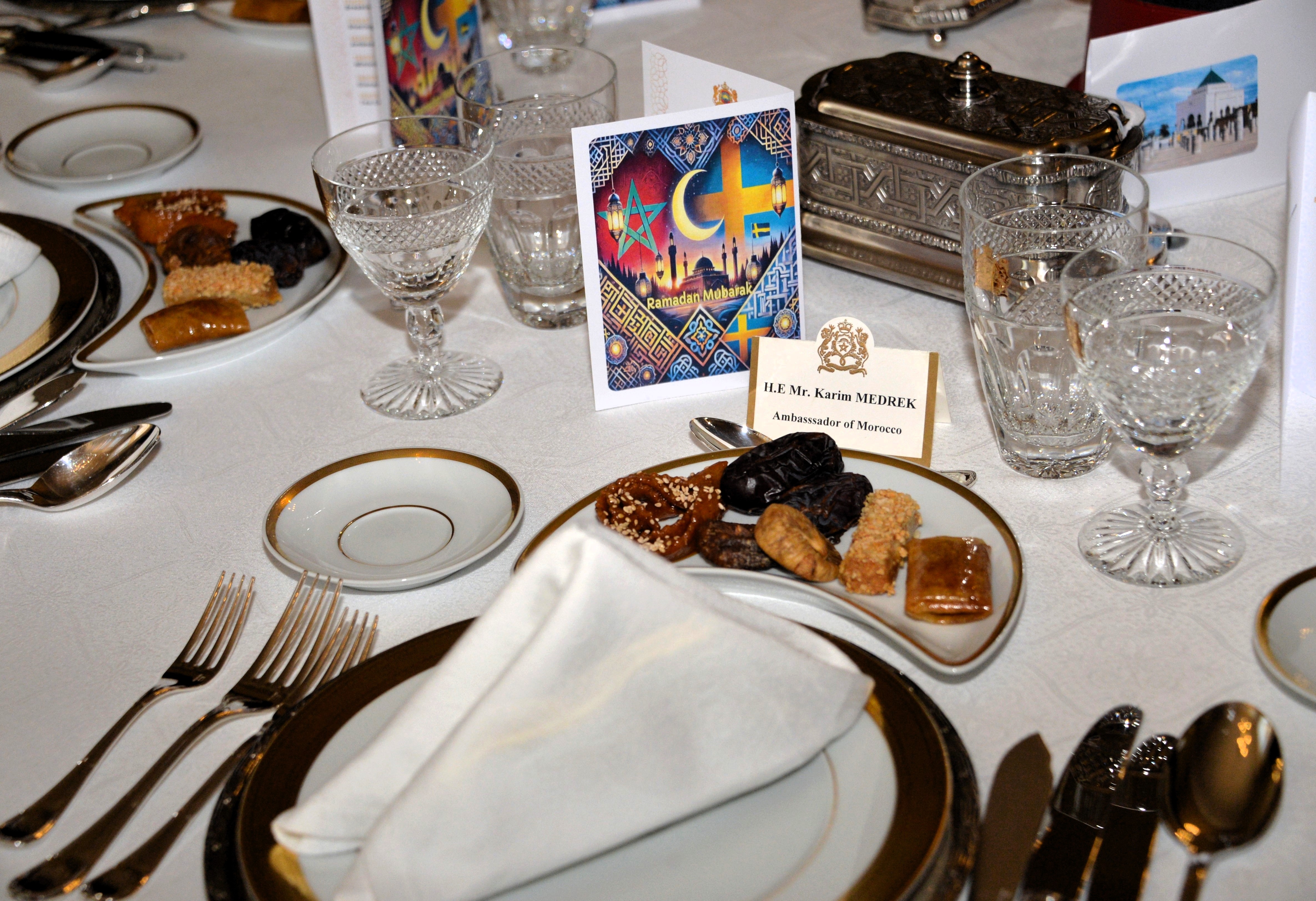 The Ambassador of Morocco H.E. Mr. Karim Medrek hosted an wonderful Iftar dinner at the Residence of Morocco on March 6th, 2025. Among some 40 VIP Guests was the Minister of Foreign Affairs of Sweden as the guest of honor. After dinner traditional Moroccan Mint Tea with cookies.