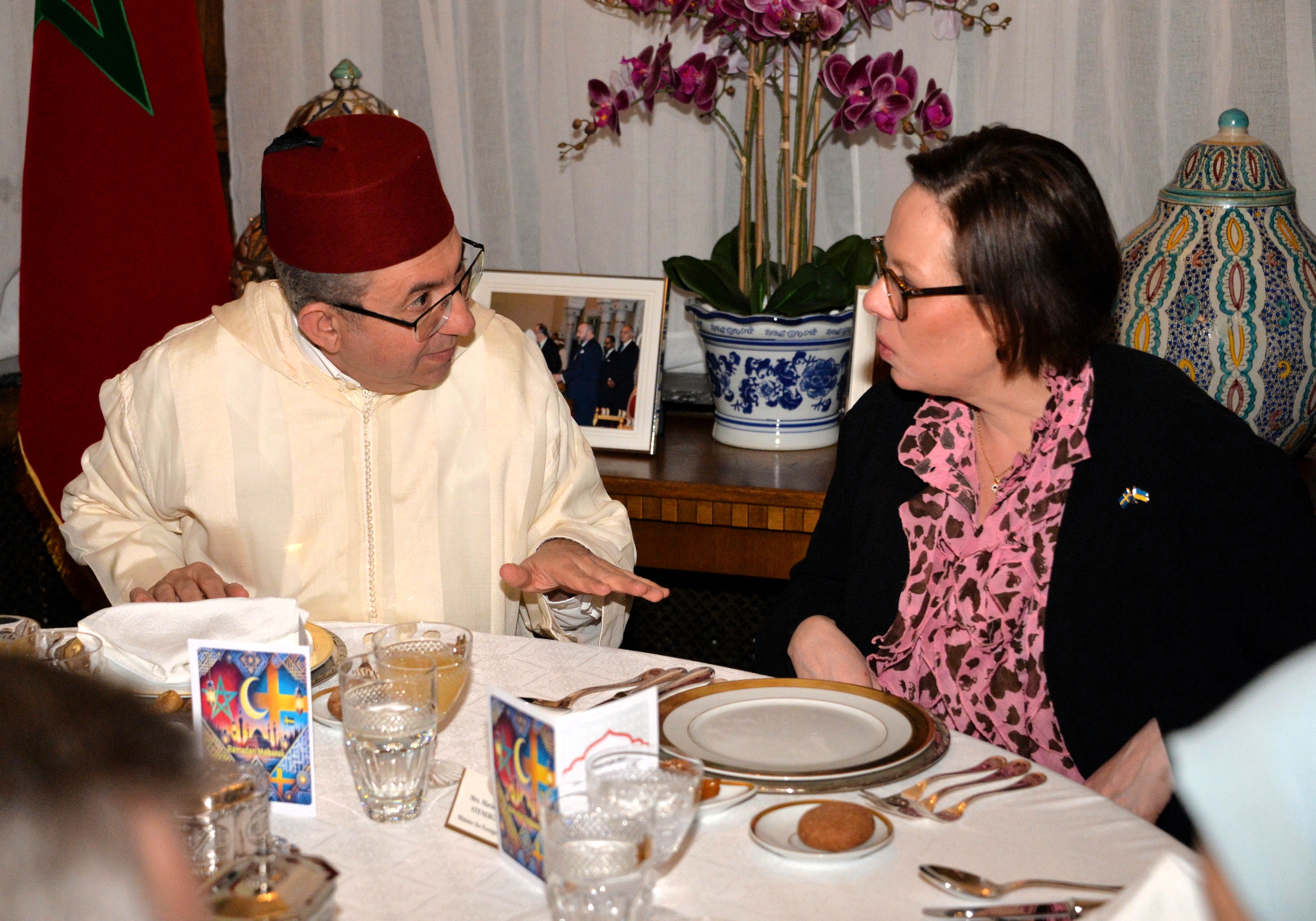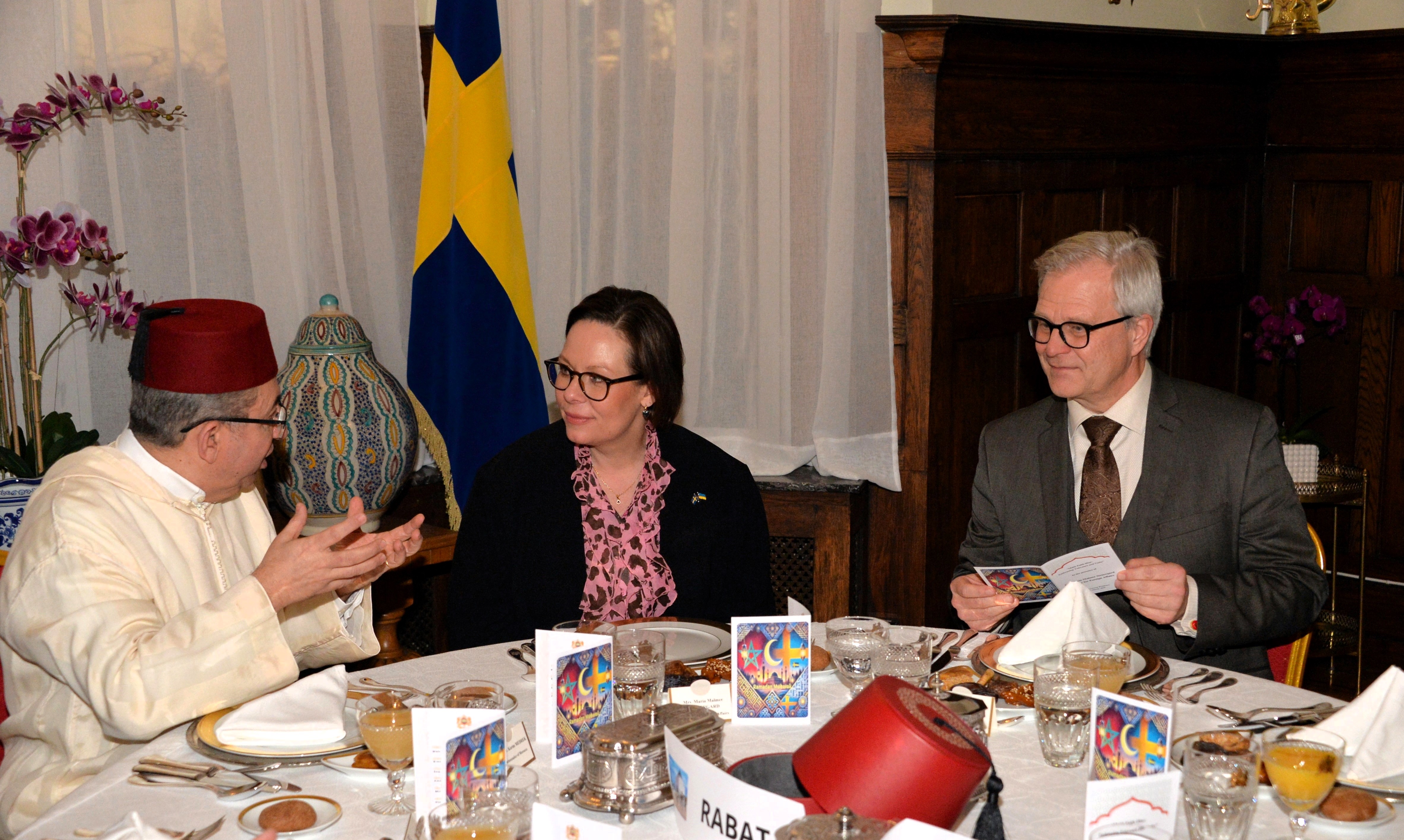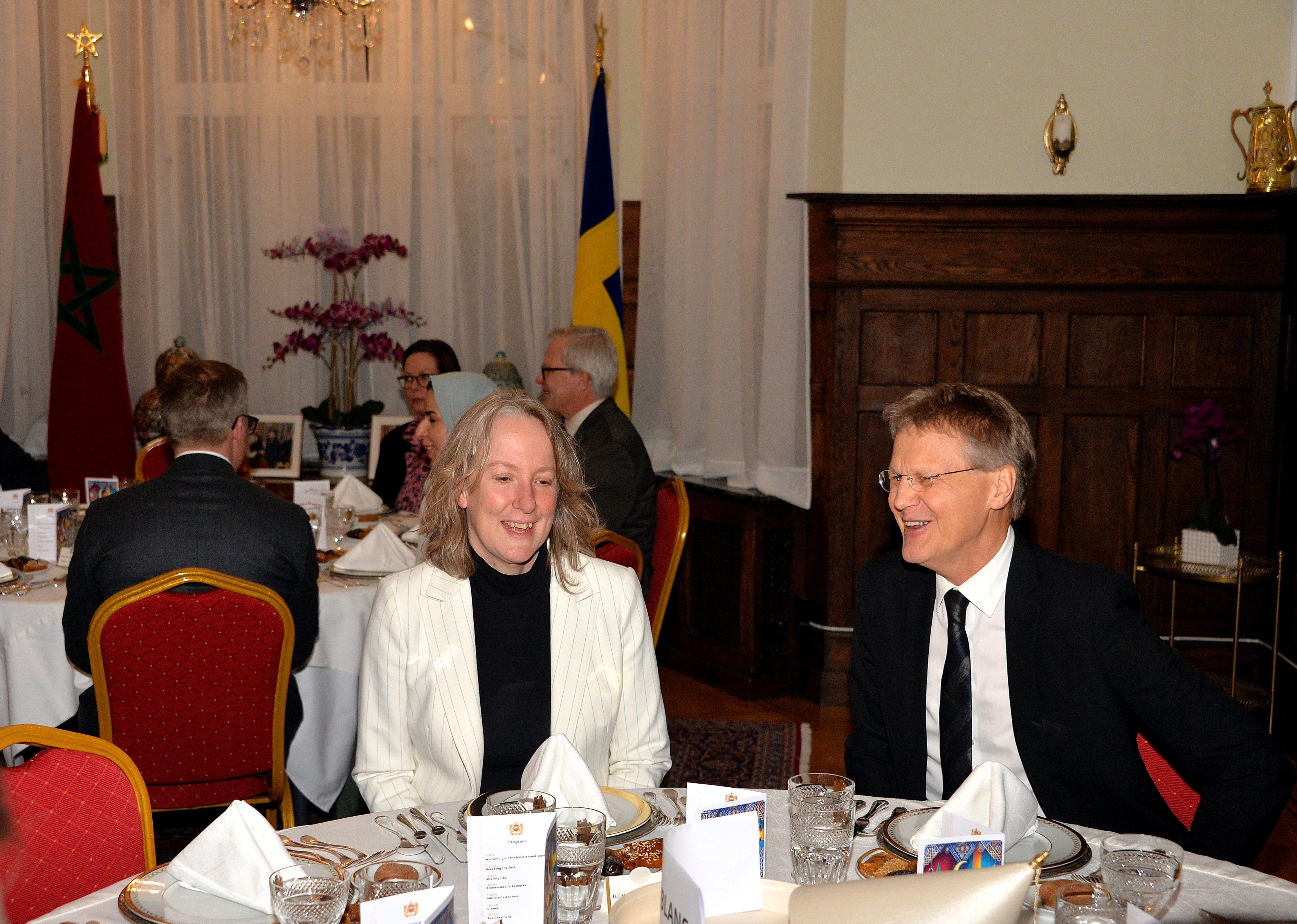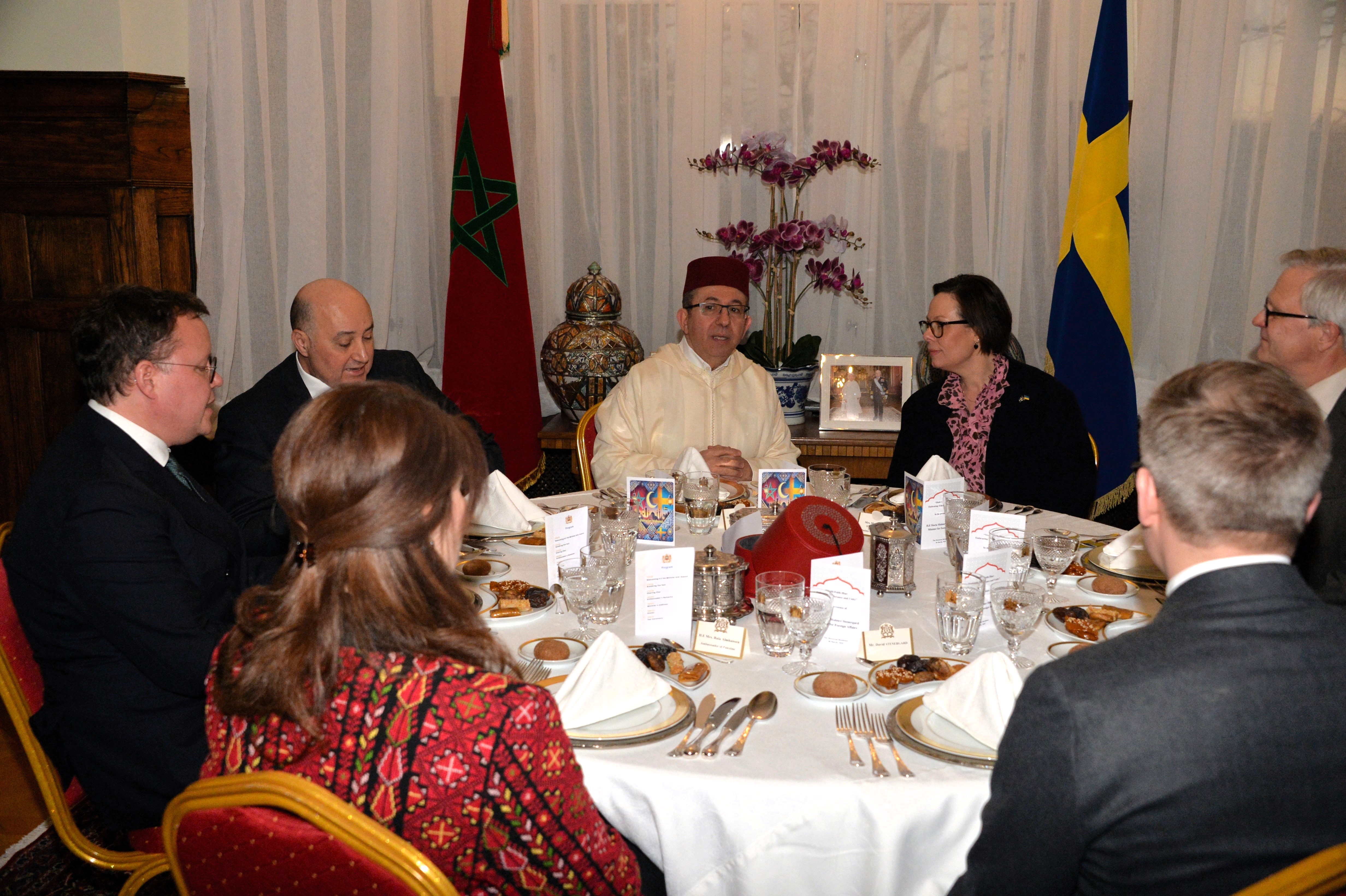 The Ambassador of Morocco H.E. Mr. Karim Medrek hosted an wonderful Iftar dinner at the Residence of Morocco on March 6th, 2025. Among some 40 VIP Guests was the Minister of Foreign Affairs of Sweden as the guest of honor. After dinner traditional Moroccan Mint Tea with cookies.