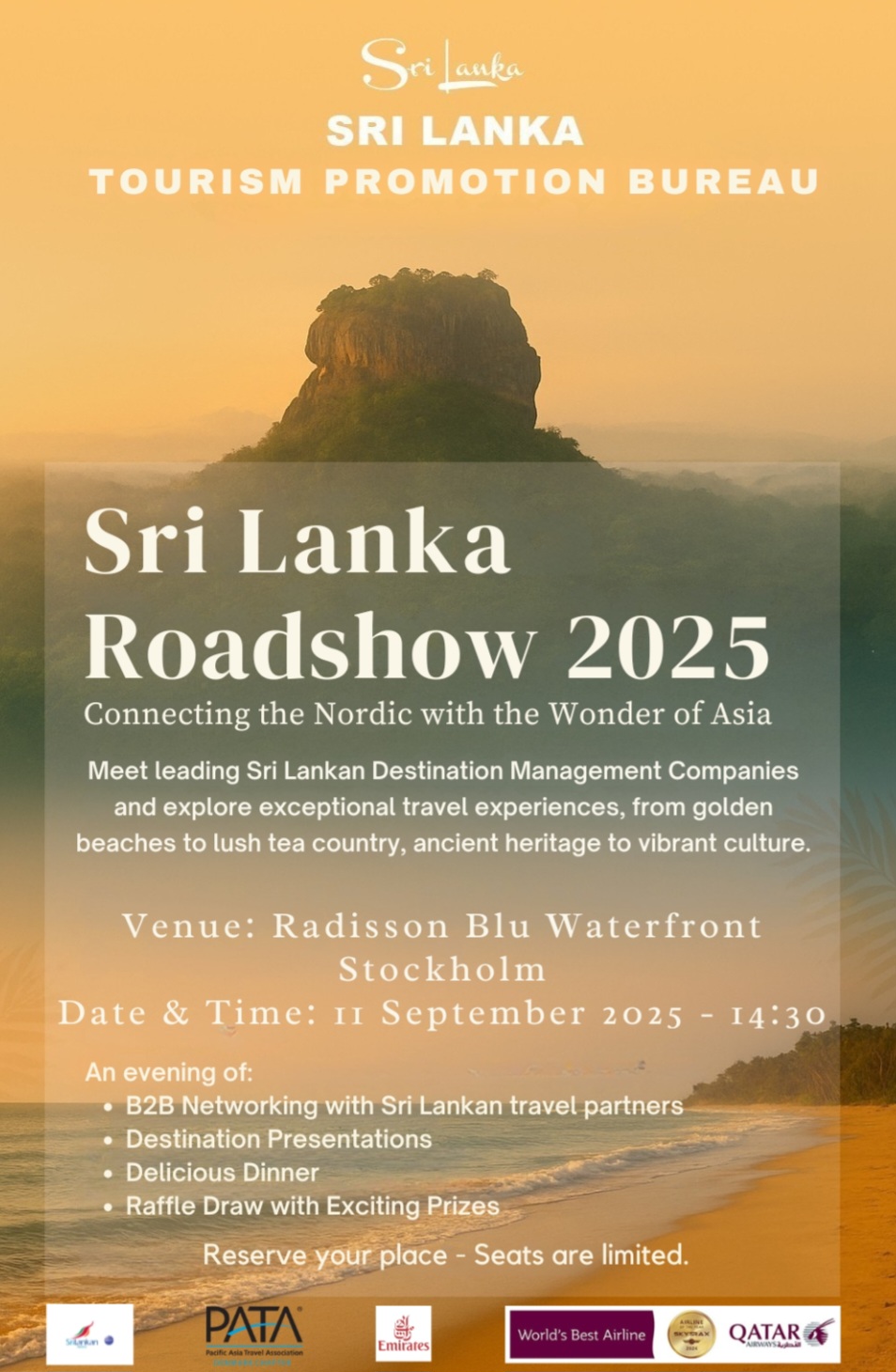 En kväll med: B2B-nätverkande med Sri Lankesiska resepartners, Presentationer av destinationer, Utsökt middag, Lotteri med spännande vinster.
